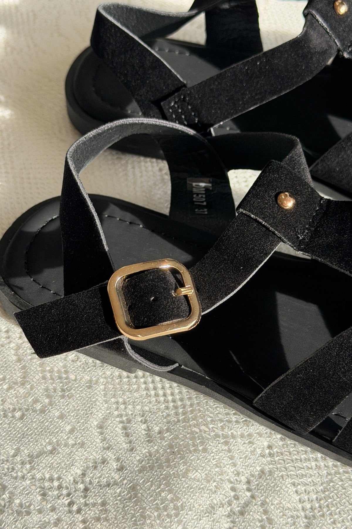 Svarta sandaler från Bloom med öppen tå och breda remmar som korsar varandra. Sandalerna har ett gyllene spänne och är lämpliga för avslappnade tillfällen.