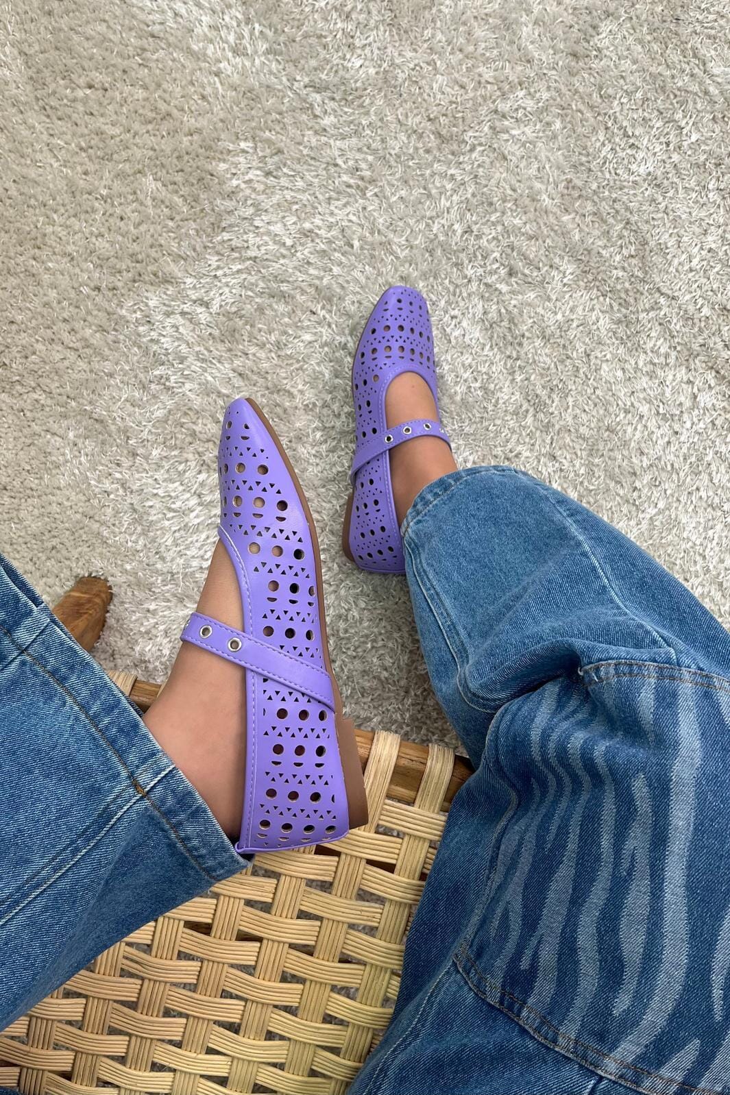 Lila ballerina från Bloom med hålmönster och spännband. Den spetsiga tån och det dekorativa mönstret ger skon ett karaktäristiskt uttryck.