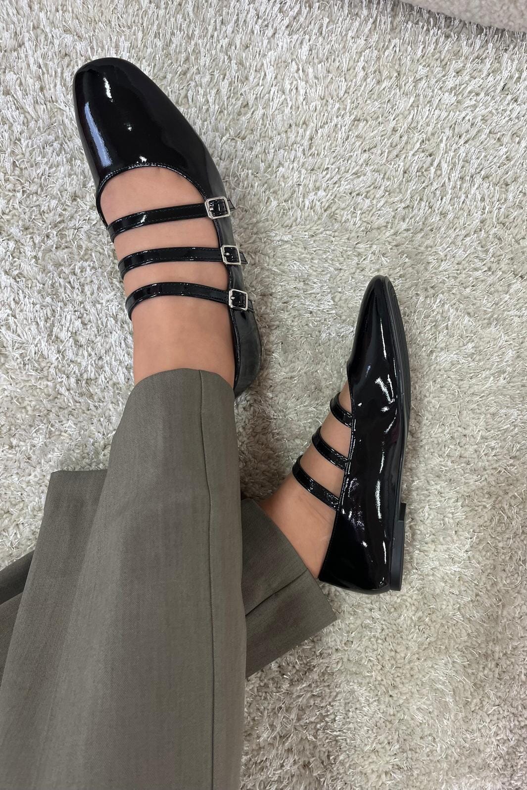 Svarta lackskor med tre spännen från Bloom. Den spetsiga tån och de smala remmarna ger skon ett klassiskt uttryck som passar både festliga och formella tillfällen.