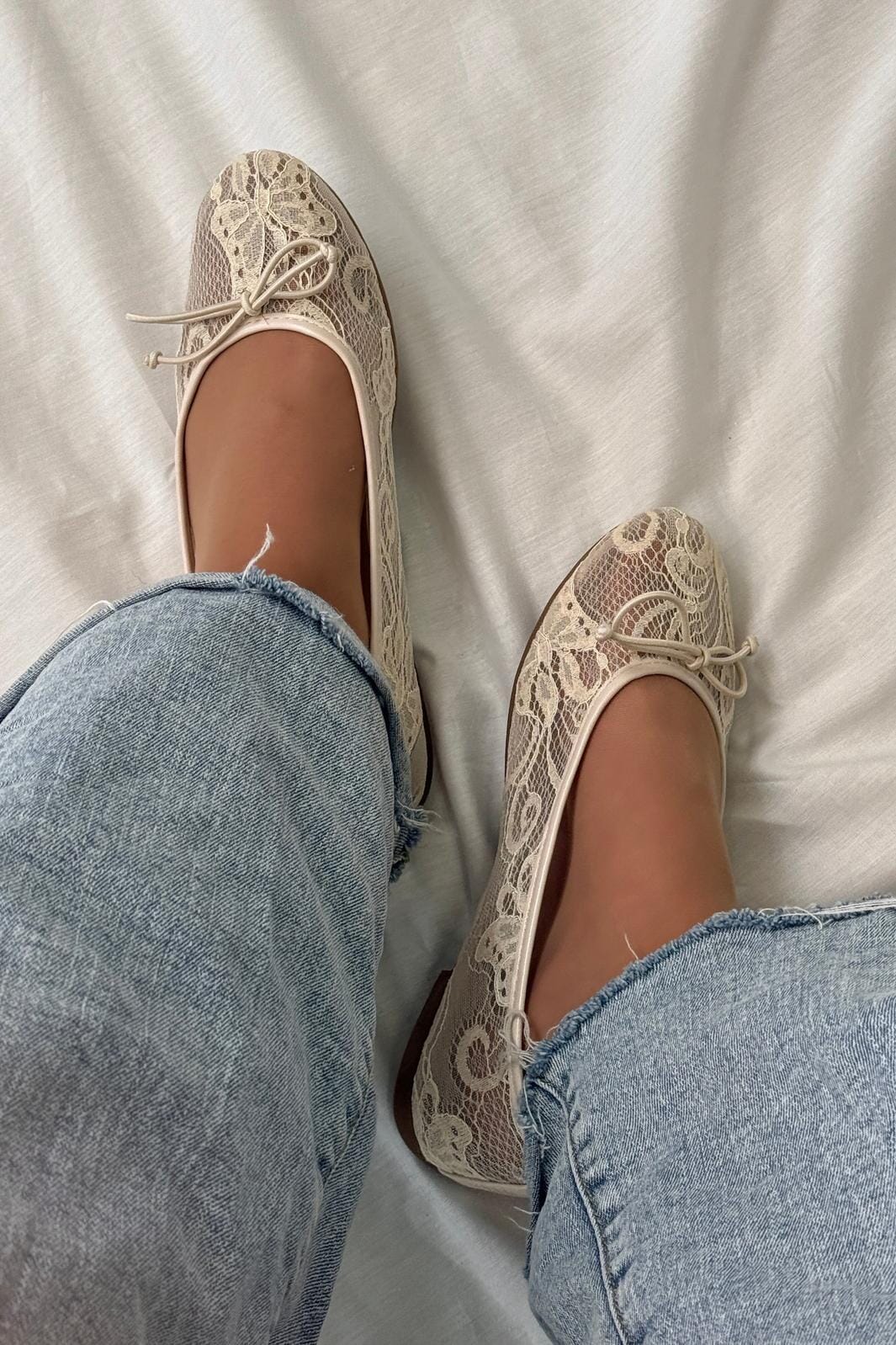 Beige ballerinaskor från Bloom med spetsytan och rosettdetalj. Skorna har en låg klack och är designade för formella tillfällen som bröllop och fester.