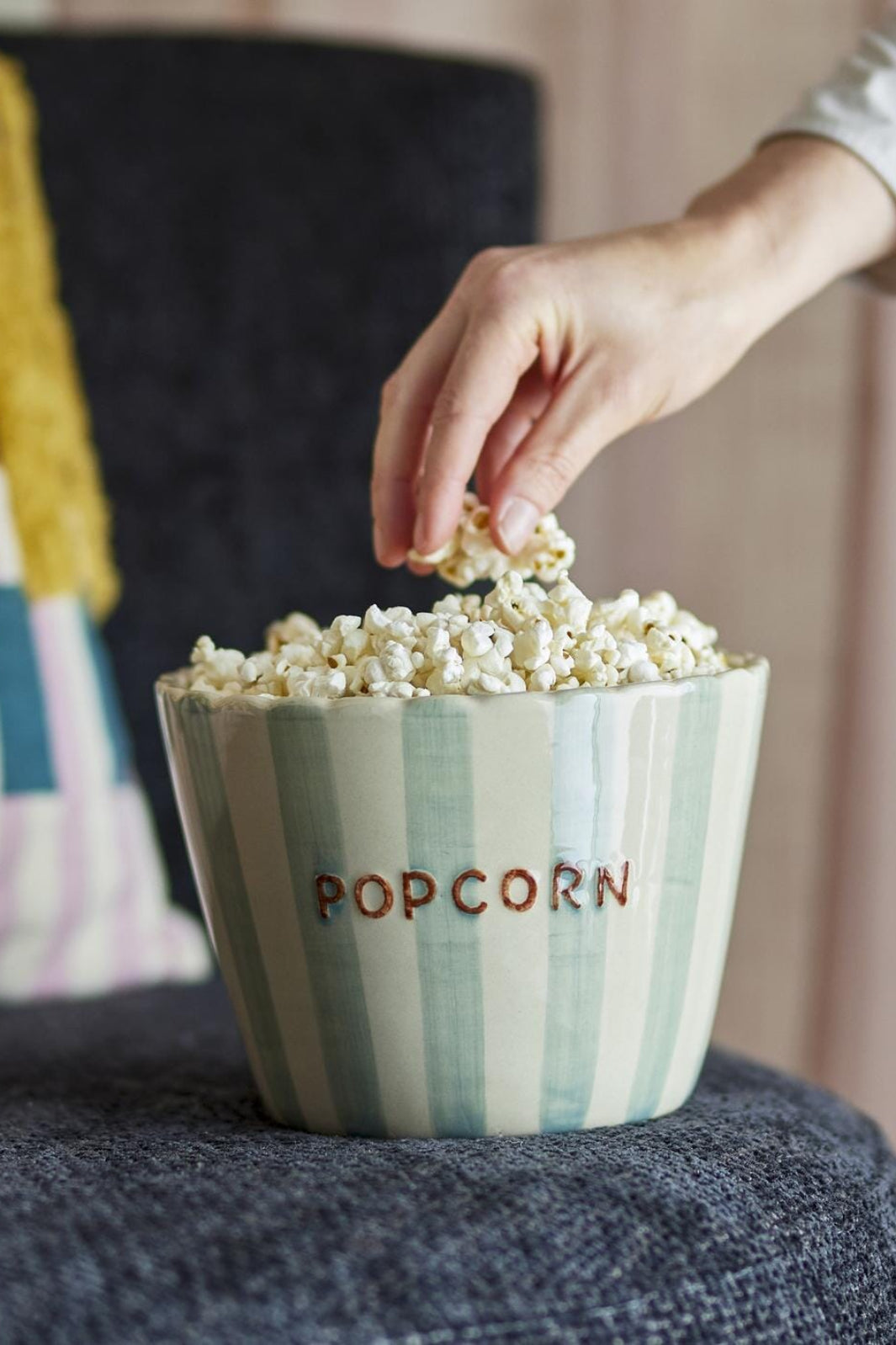 Skål från Bloomingville, tillverkad av stengods med handmålade ränder och texten POPCORN. Kanten är vågig och insidan har beige prickar. Små variationer i mönstret kan förekomma.