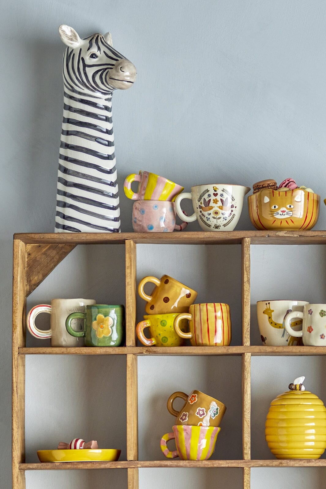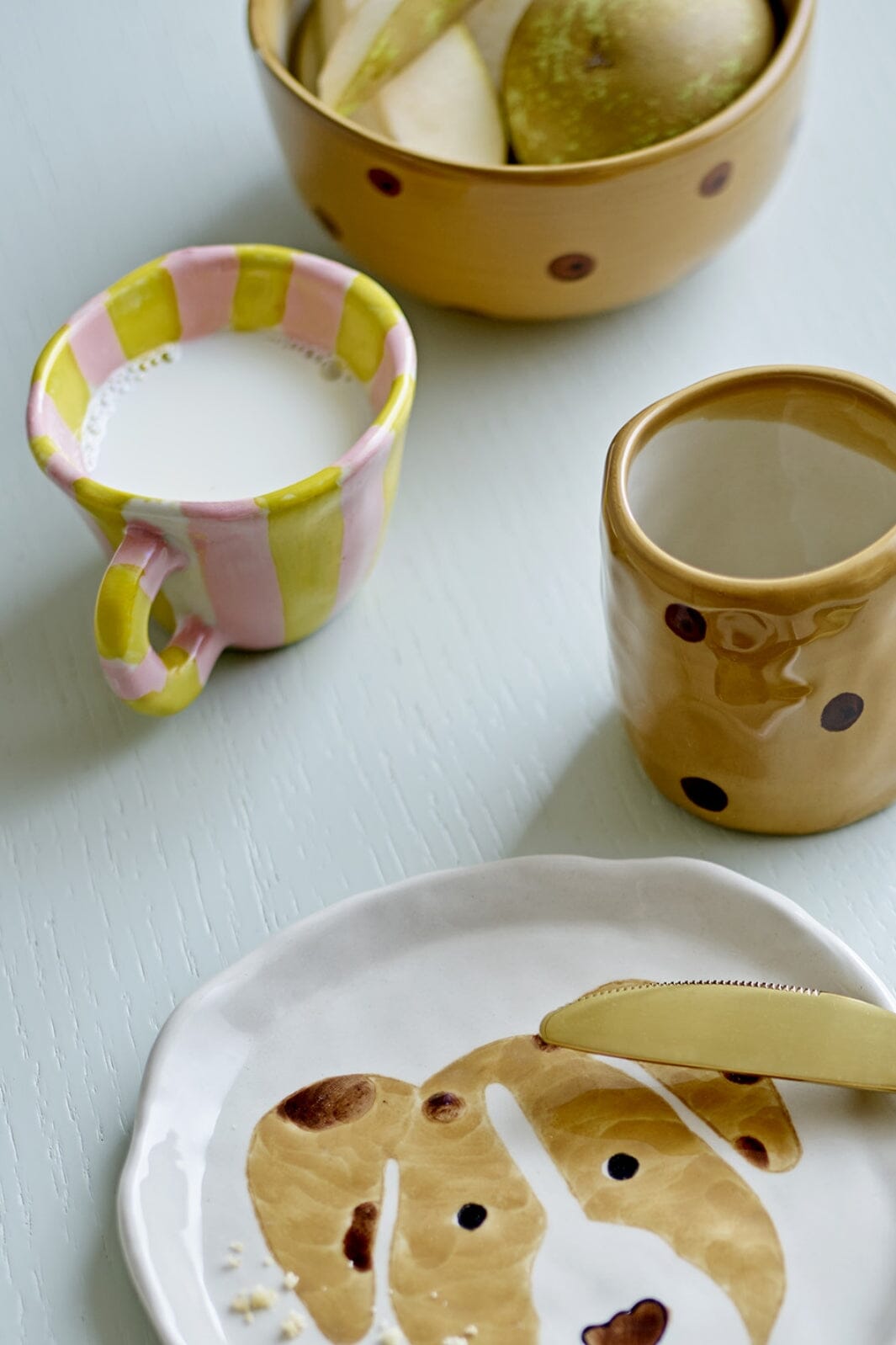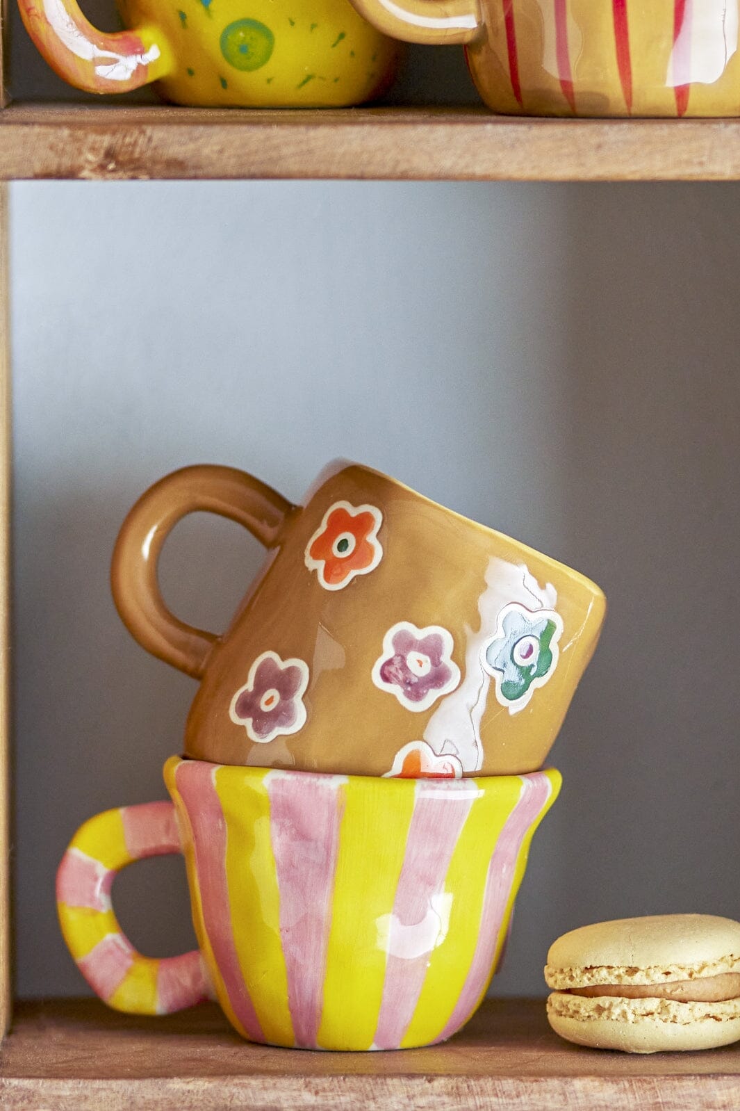 Randig kopp från Bloomingville i stengods med rosa och gula ränder. Koppen har en blank yta och ett praktiskt handtag.