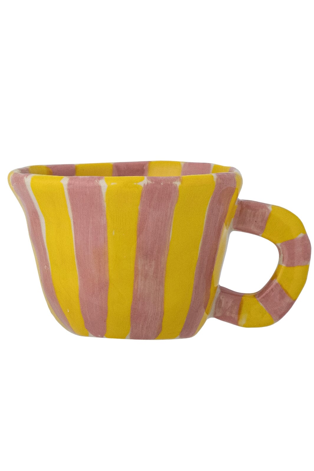 Randig kopp från Bloomingville i stengods med rosa och gula ränder. Koppen har en blank yta och ett praktiskt handtag.