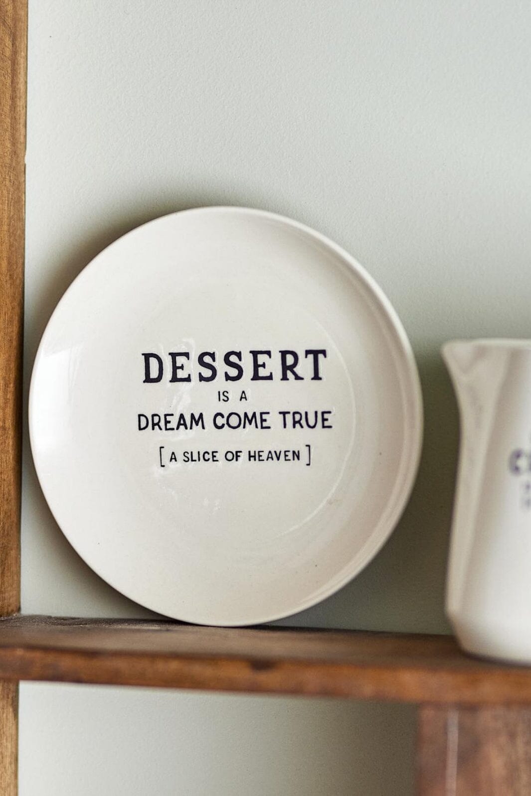 Vit desserttallrik från Bloomingville i stengods med svart text. Den runda tallriken har citatet Dessert is a dream come true, a slice of heaven tryckt på ytan.
