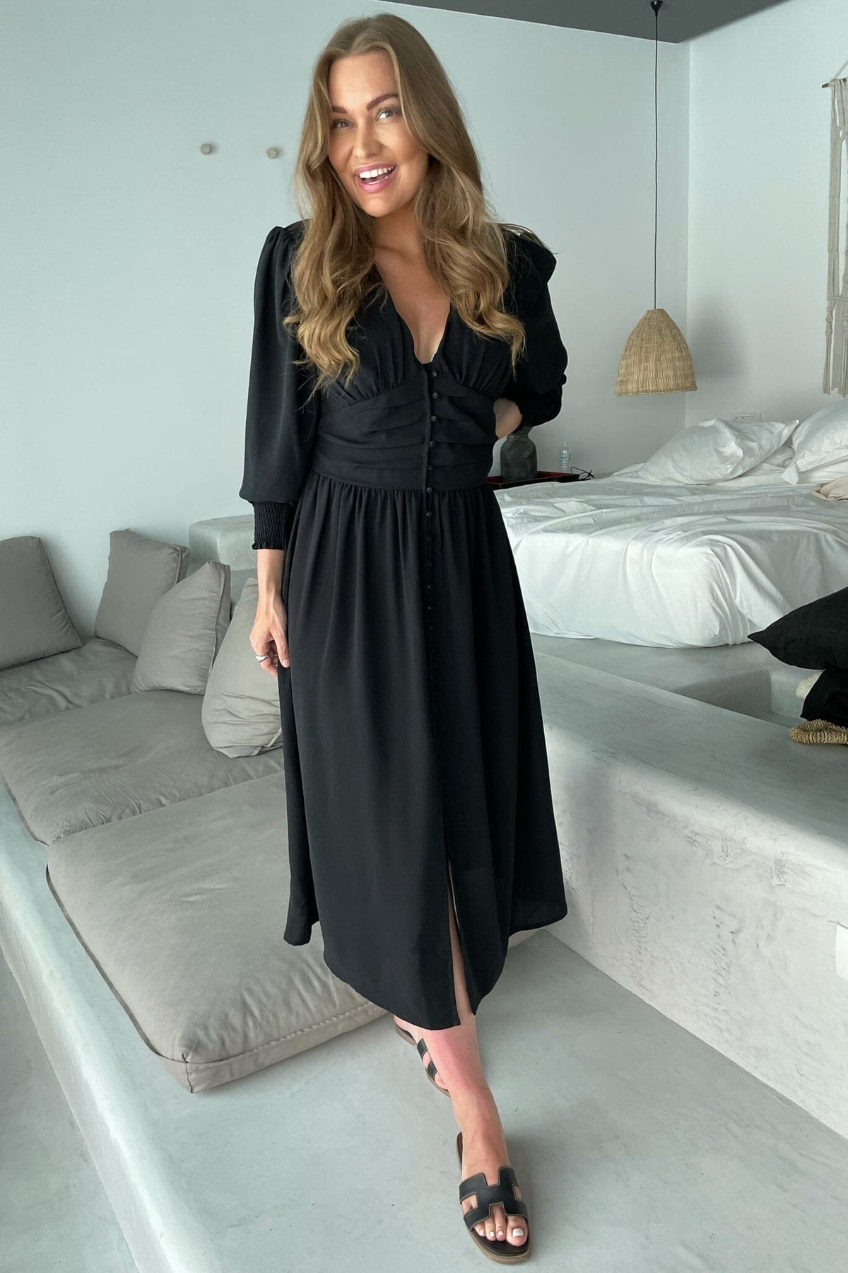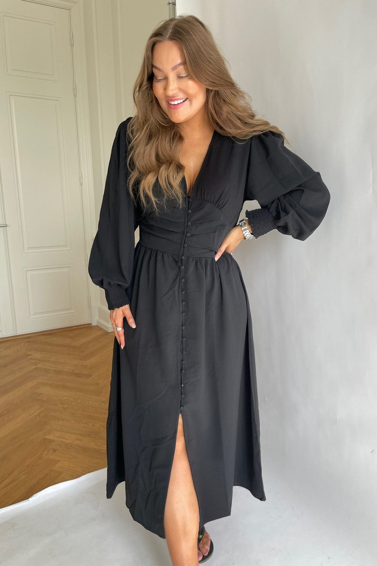 Svart lång klänning från BYIC med V-ringning och insvängd midja. Klänningen har puffärmar och en rad knappar längs framsidan. En slits på sidan ger rörelsefrihet.