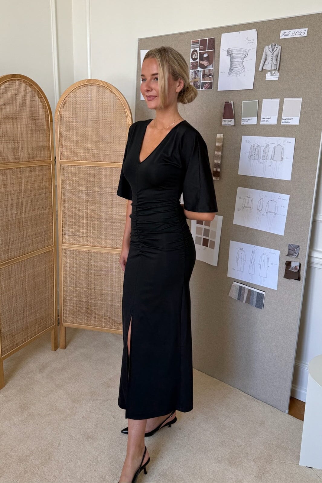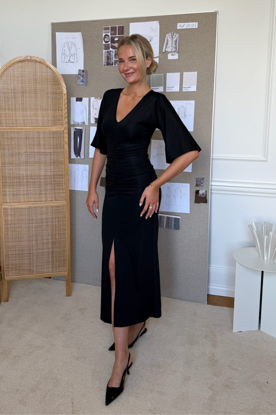 Svart klänning från BYIC med V-ringning och vida ärmar. Klänningen har rynkor längs mitten och en slits fram. Tyget är lätt glänsande med ett mjukt fall.