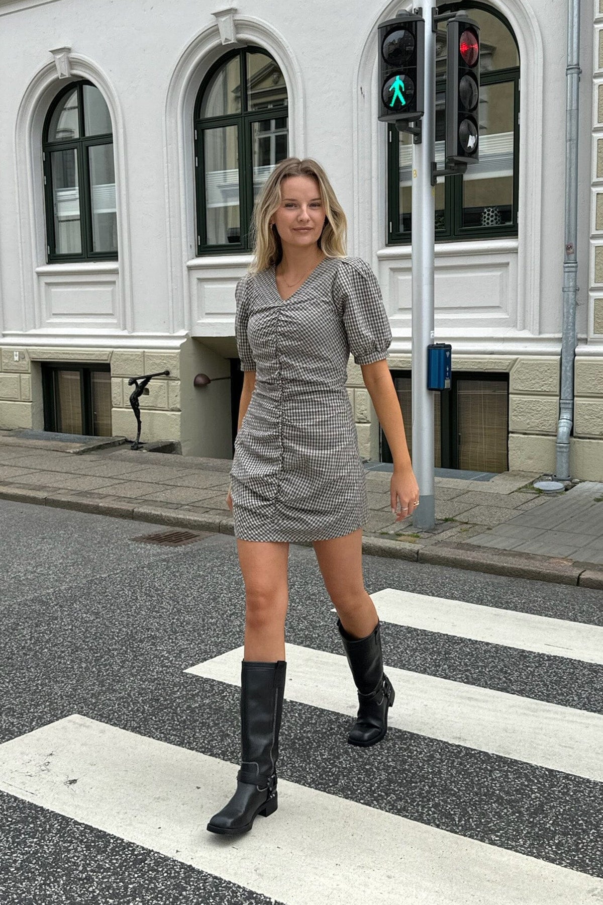 Rutigt klänning från BYIC med rynkade detaljer fram. Klänningen har puffärmar och v-ringning. Det svart-vita rutiga mönstret återkommer i hela designen.