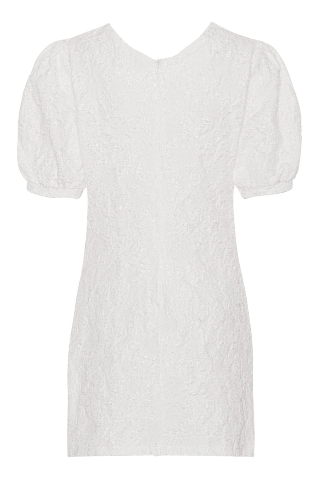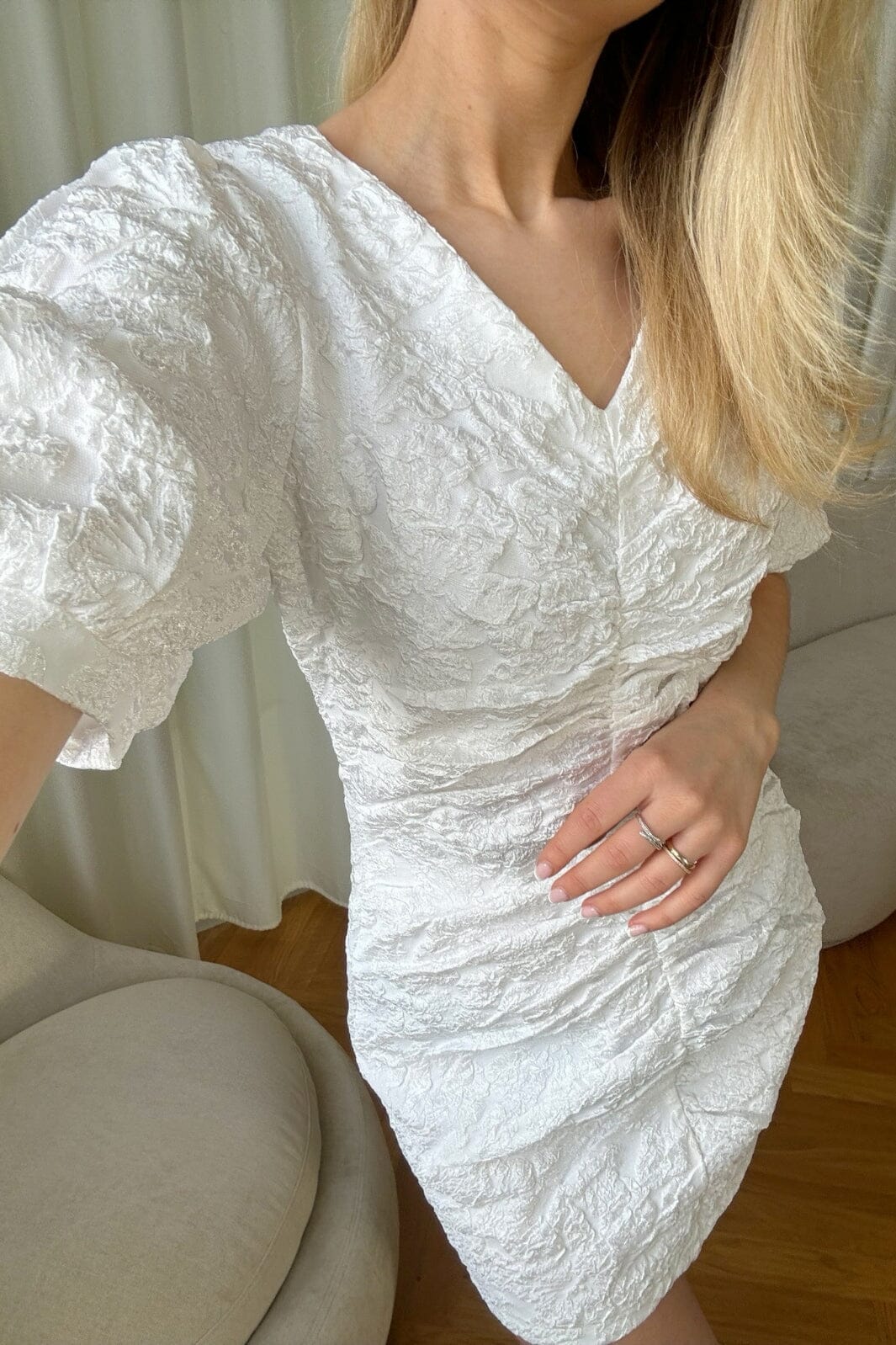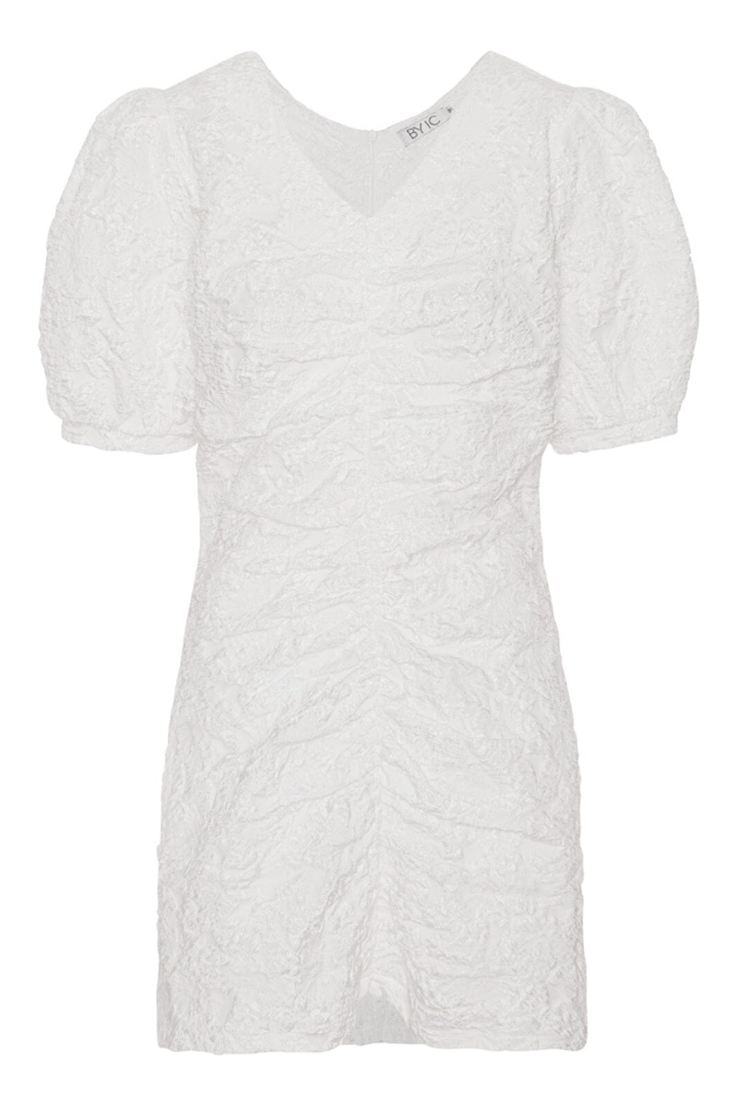 Vit klänning från BYIC med rynkad textur och V-ringning. Klänningen har korta puffärmar och en kort längd som gör den lämplig för festliga tillfällen.