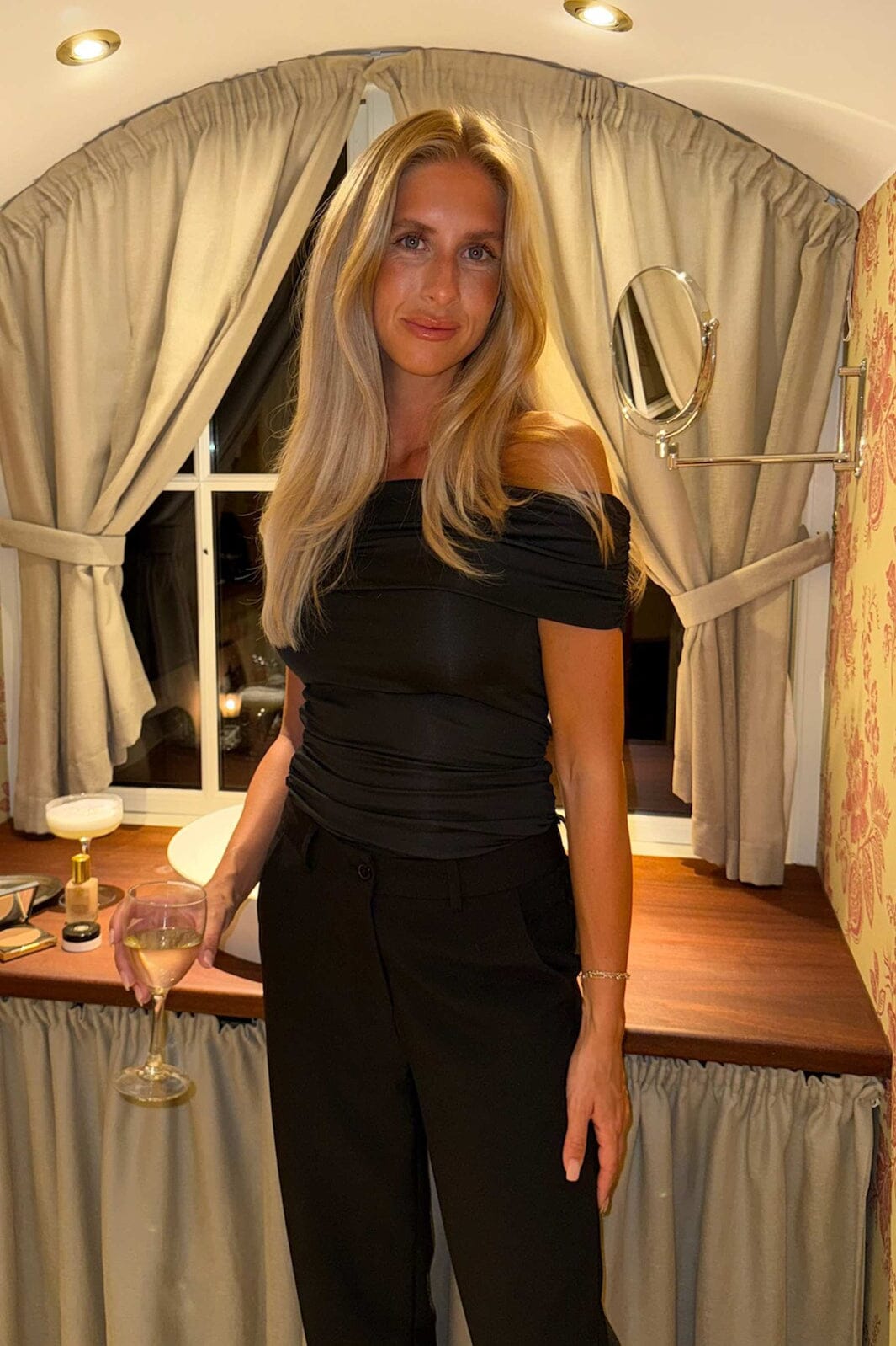 Svart topp från BYIC med off-shoulder-design. Toppen har rynkade detaljer längs sidorna och på axelpartiet. Den figurnära modellen är tillverkad i stretchigt tyg.