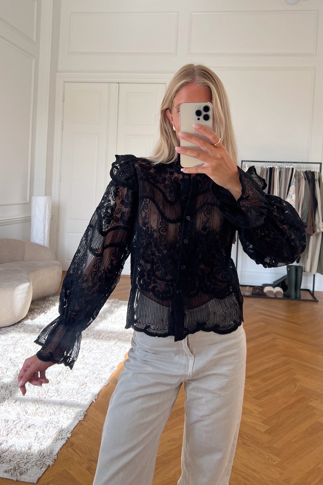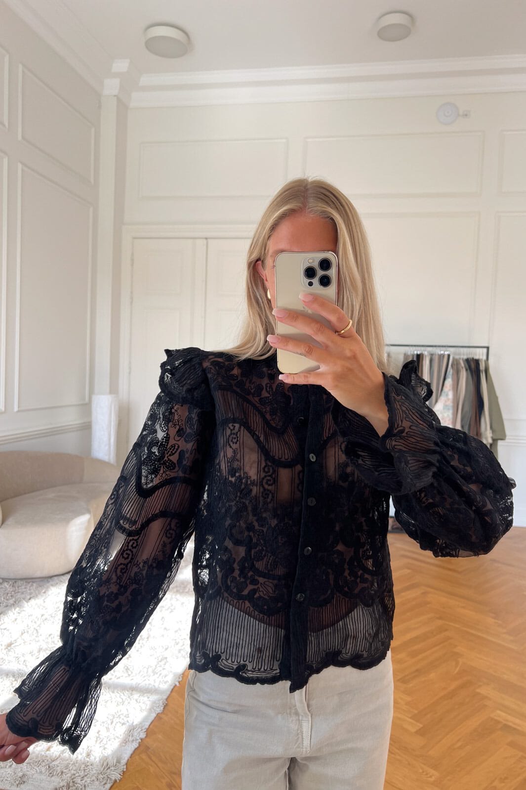 Svart skjorta i genomskinlig spets med hög krage och knapplåsning. Skjortan har puffärmar med volangdetaljer och en lös passform som gör den lämplig för både vardag och fest.