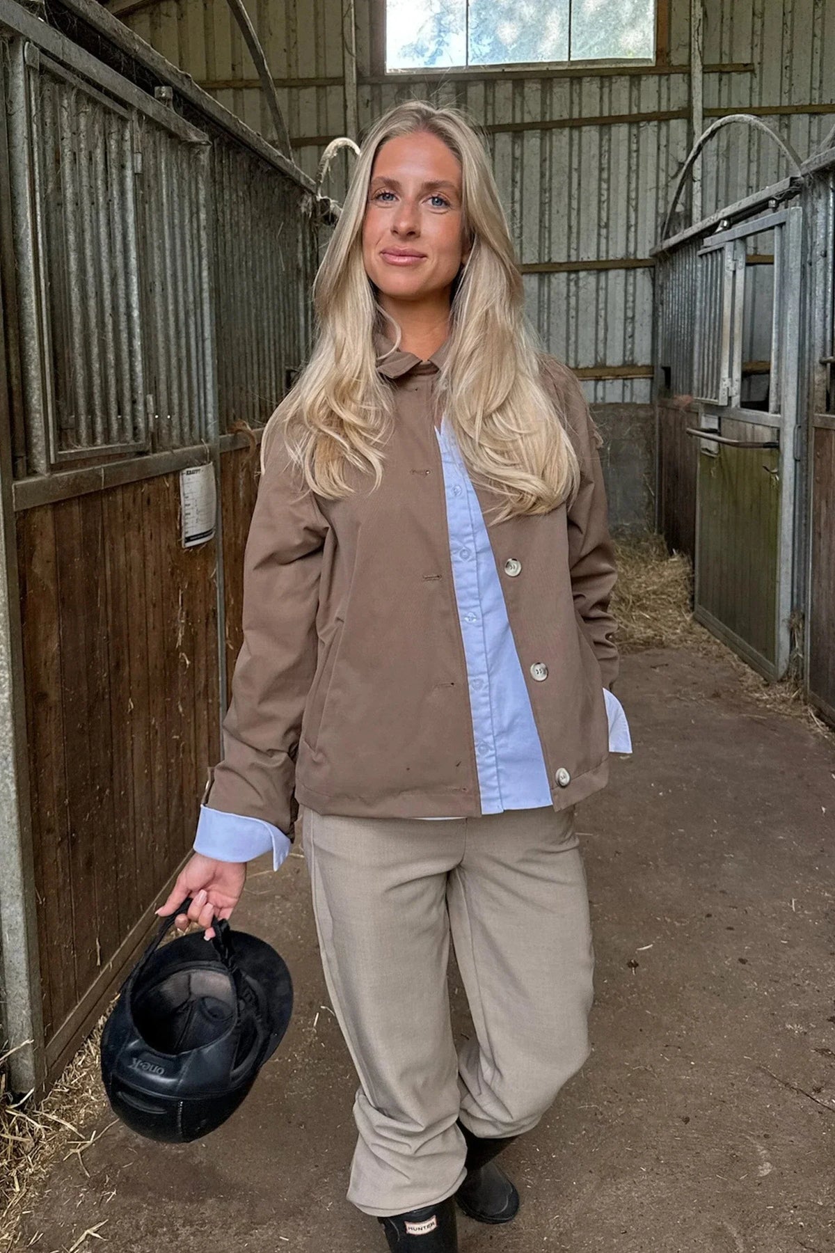Den har stora naturfärgade knappar framtill för stängning och stroppdetaljer på ärmarna, som också är fästa med en stor naturfärgad knapp.