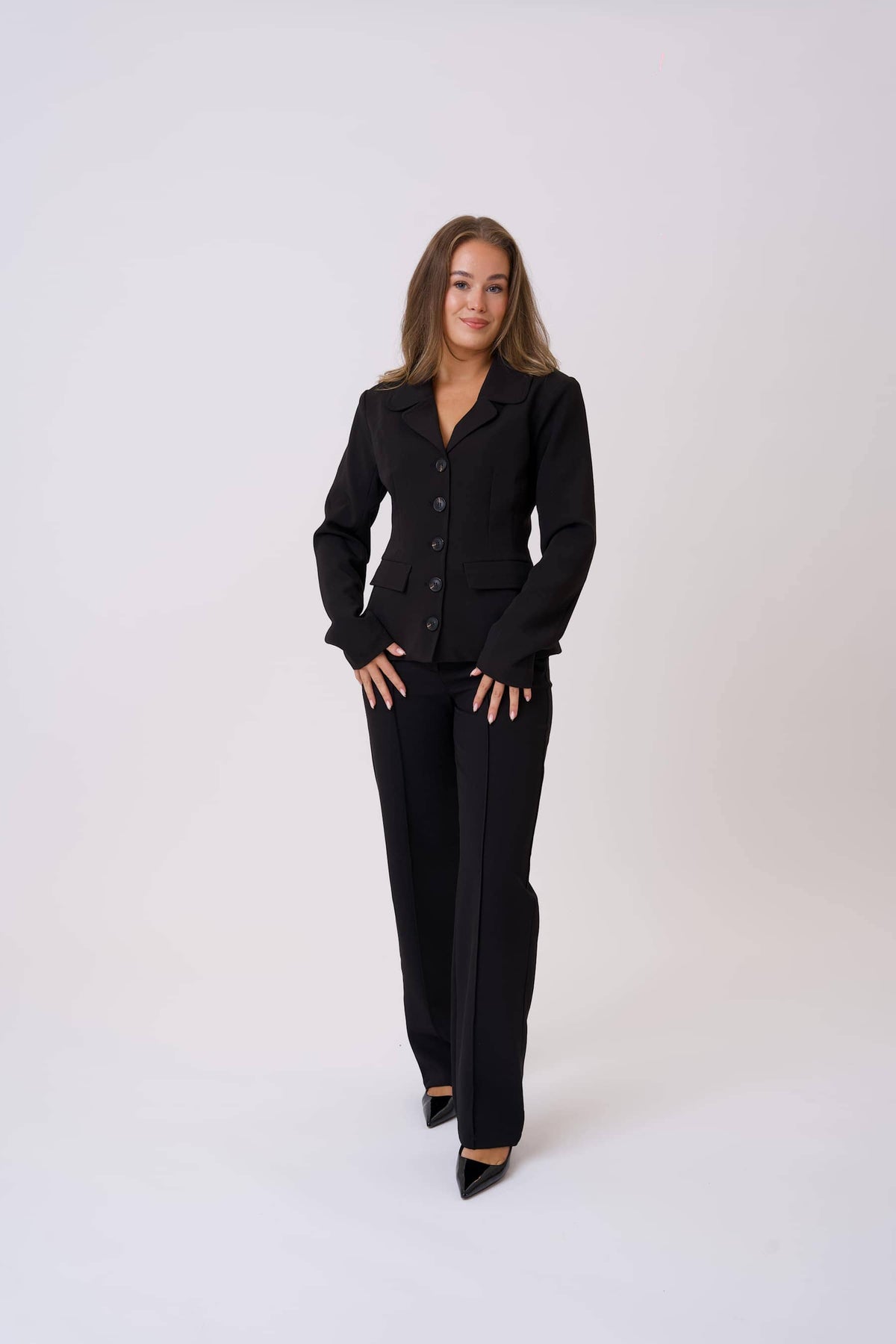 Svart blazer från BYIC med slim fit-snitt. Blazern har klassisk skjortkrage, knappar i naturfärger och två fickor med klaff fram. Det strukturerade tyget ger en markerad midja.