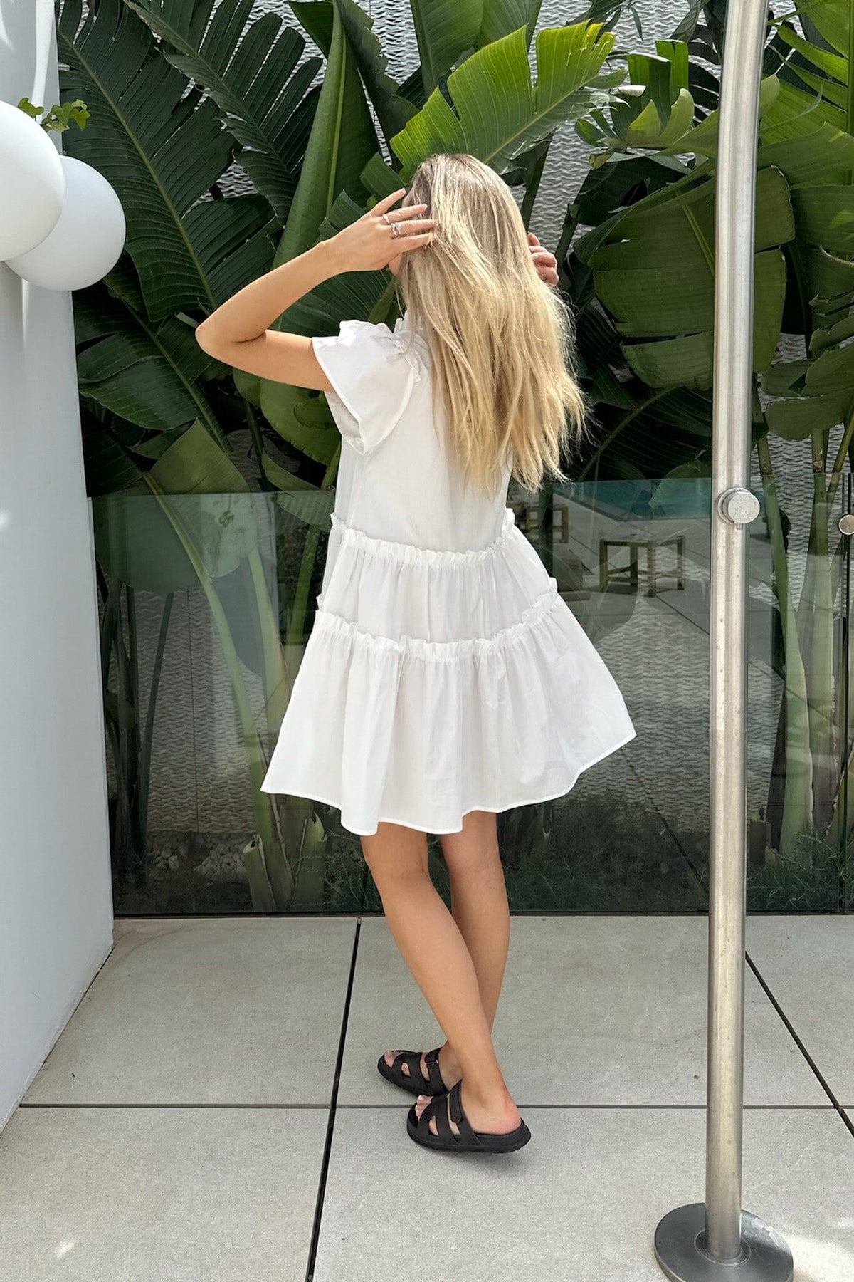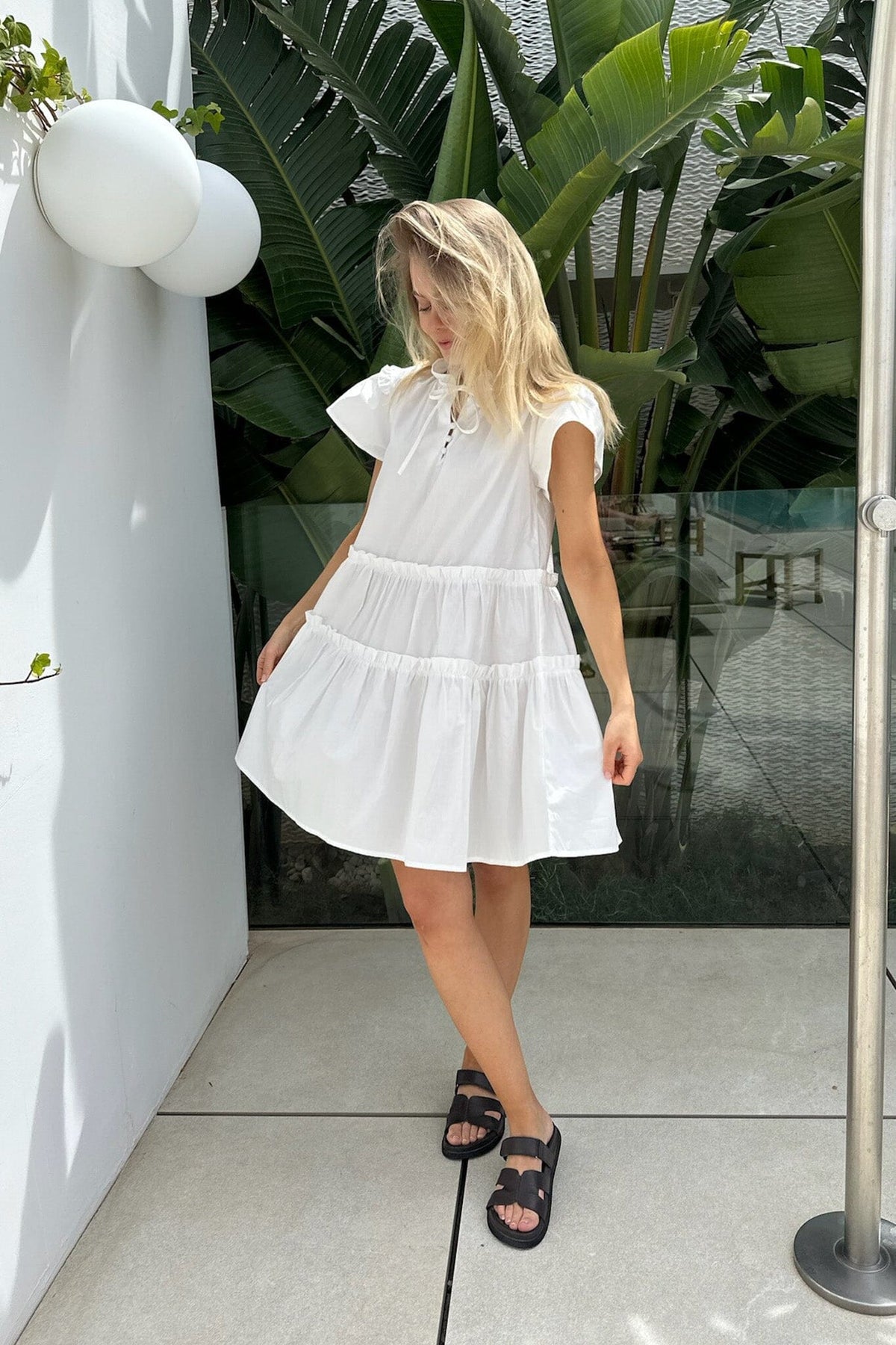 Vit klänning från BYIC med lager av volanger och Peter Pan-krage. Korta ärmar med volangdetaljer och bindband i halsen ger klänningen en feminin touch.
