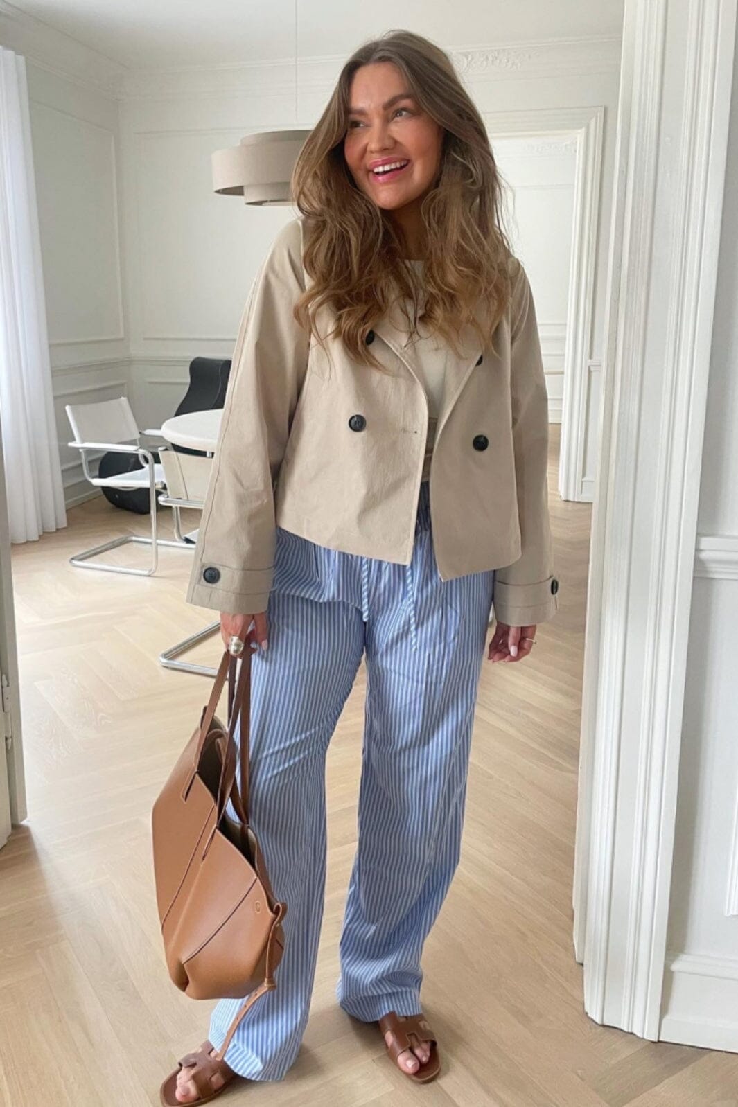 Blue and white striped pants with pockets on each side and has a regular tie around the waist. Style it with our Hannah shirt. True to size.