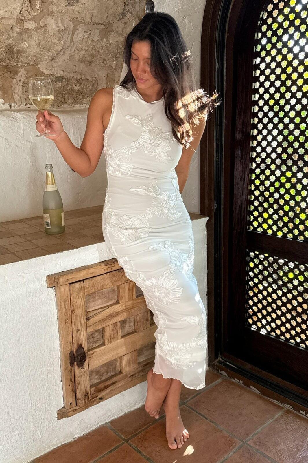 Vit meshklänning från BYIC med broderade 3D-blommor och rynkdetaljer på sidorna. Klänningen har en figurnära passform och små volanger vid axlarna.