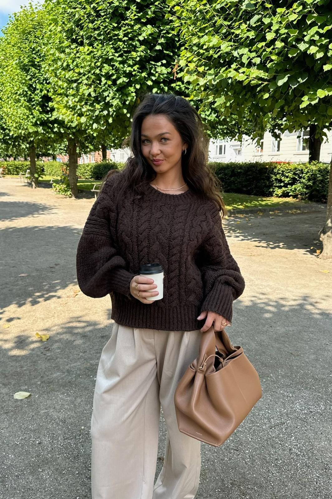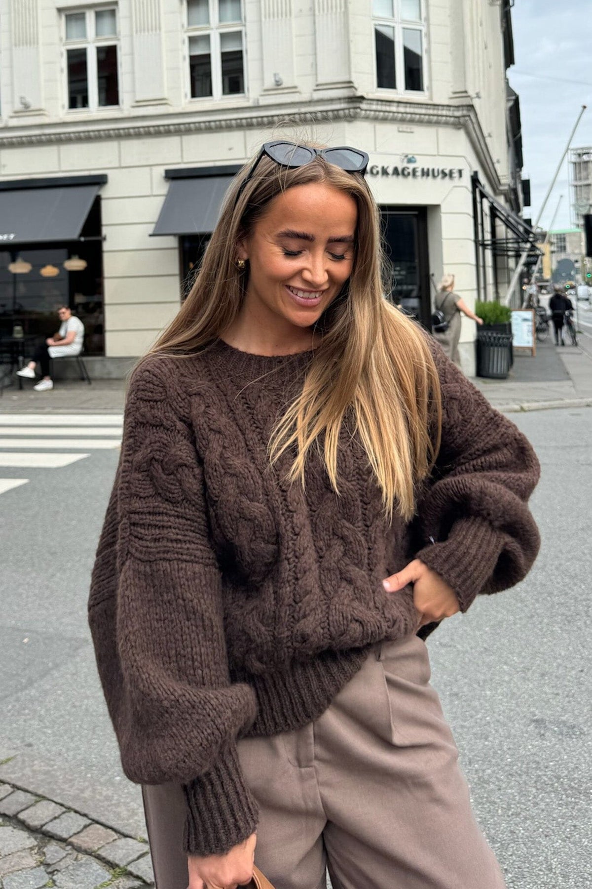 Chokladbrun tröja från BYIC med kabelstickat mönster. Den lösa passformen och det tjocka garnet ger tröjan ett rustikt uttryck med god värme.
