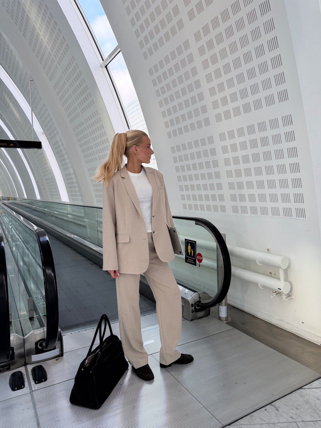 Beige kavaj från BYIC, tillverkad av 96 % polyester och 4 % elastan i huvudtyget med polyesterfoder. Kavajen har en oversized passform.