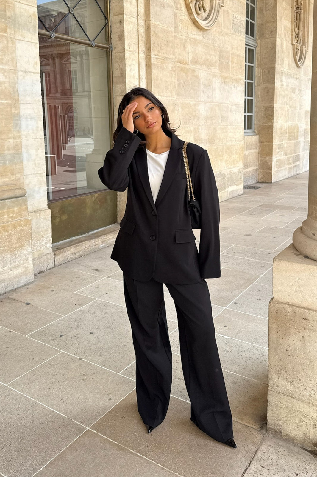 Svart blazer från BYIC med skjortkrage och två knappar fram. Den har rak passform, långa ärmar och praktiska fickor - en bröstficka och två fickor med klaff längst ner på blazern.