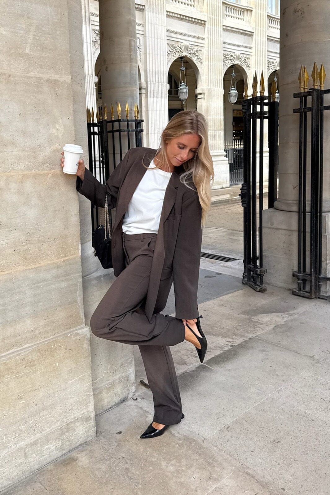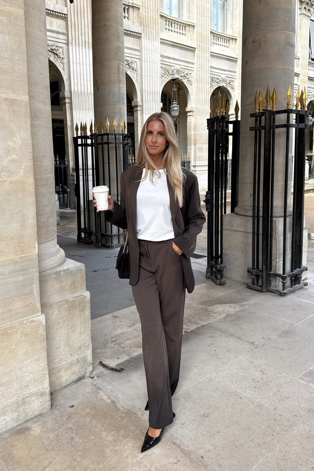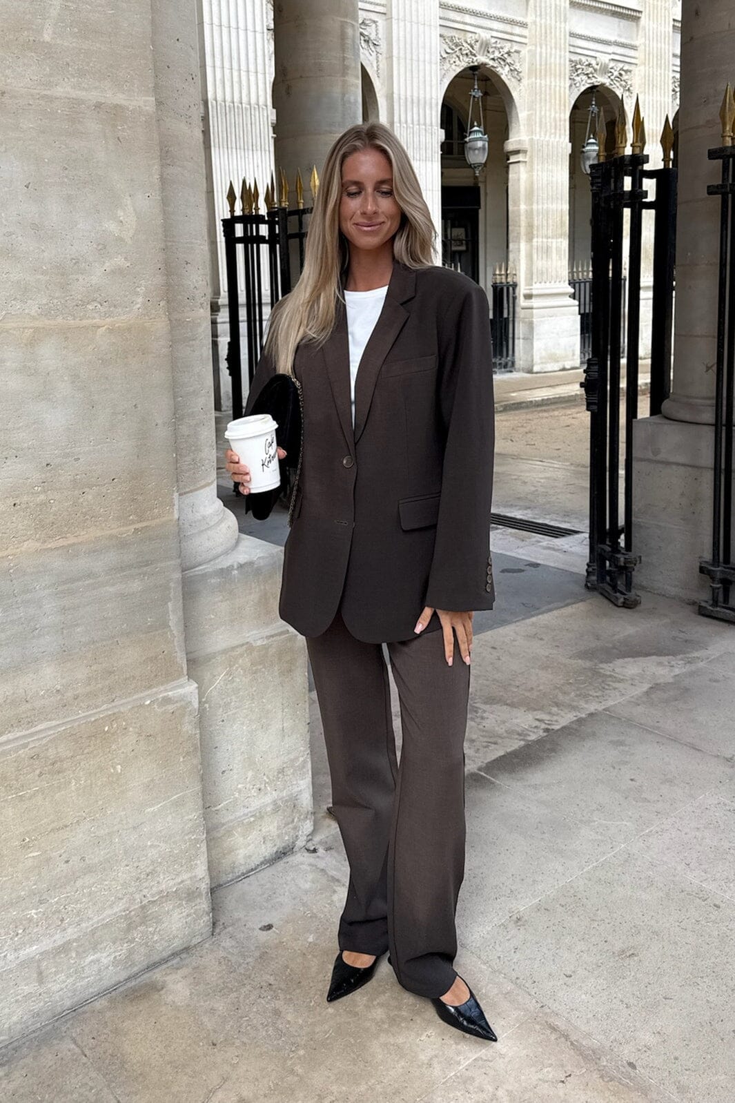 Mörkbrun blazer från BYIC med V-hals och rak passform. Den har en enkel knapp framtill, fickor på båda sidor och en bröstficka på vänster sida.