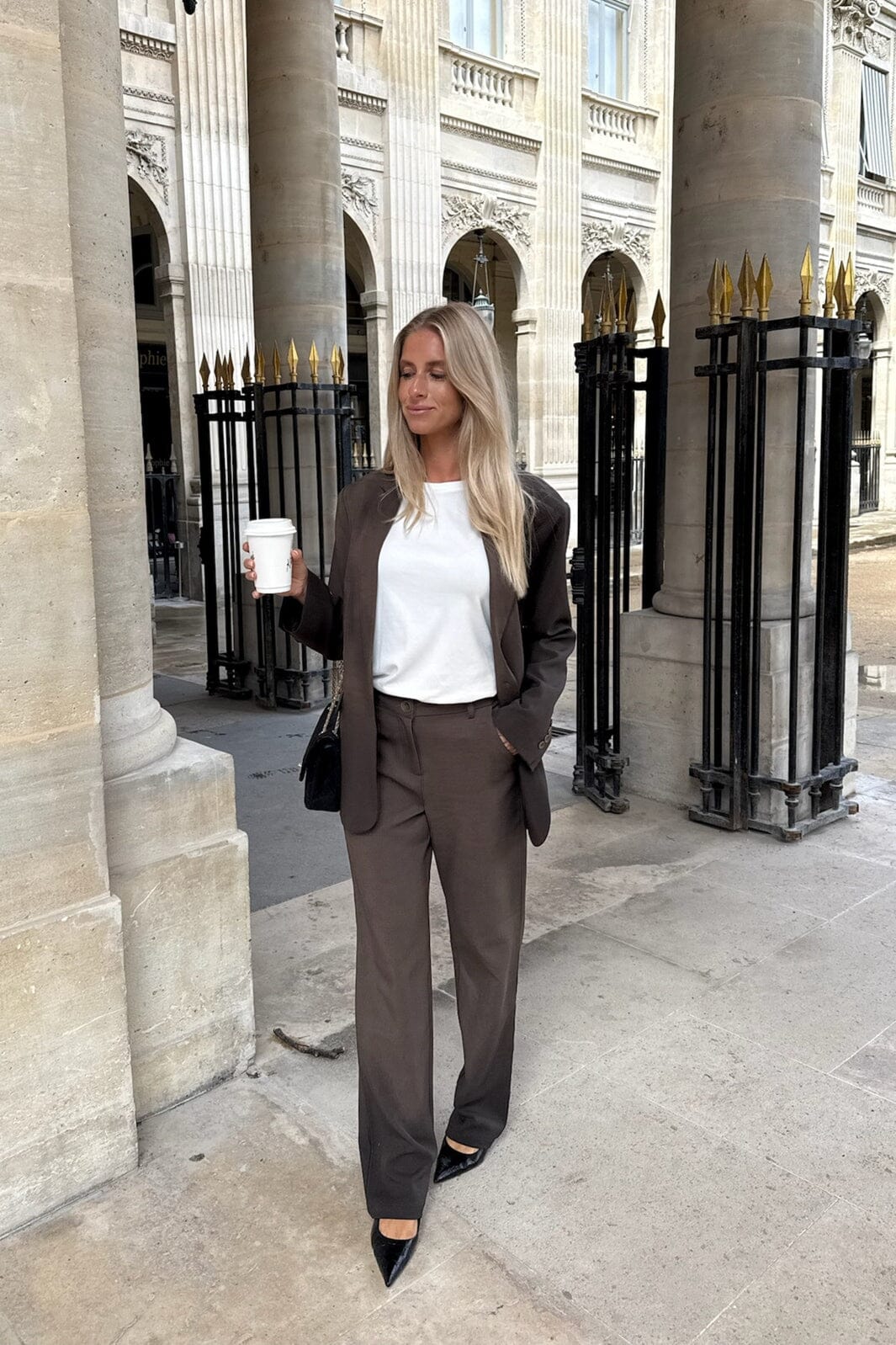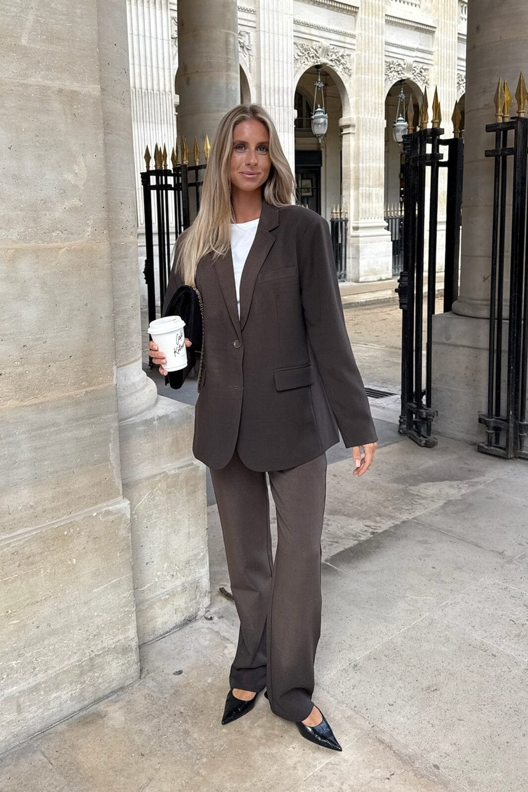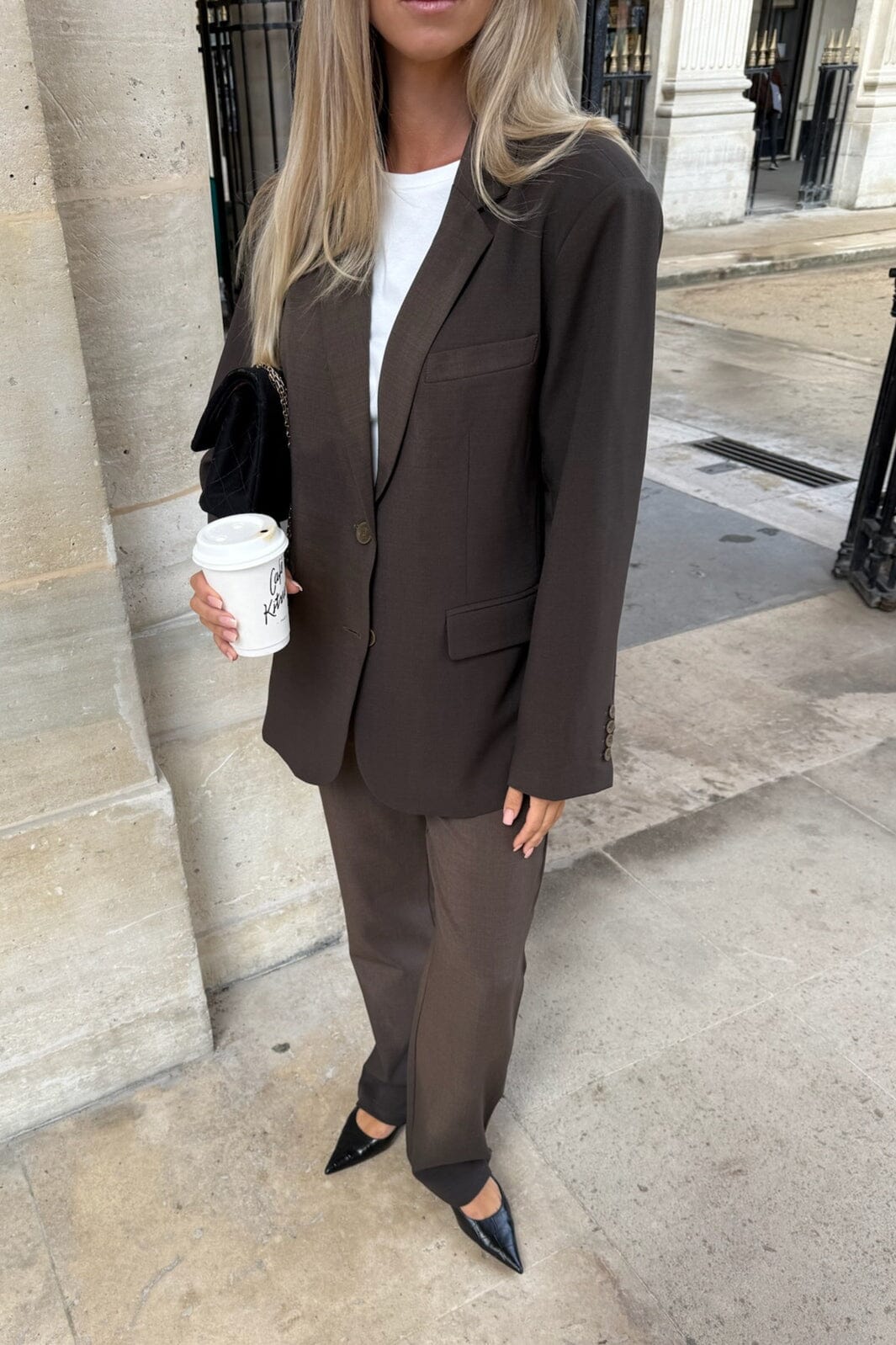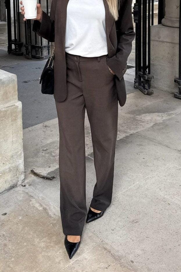 Mörkbruna byxor från BYIC med rak passform och hög midja. Byxorna har bälteshällor i midjan samt knapp- och dragkedjestängning fram.