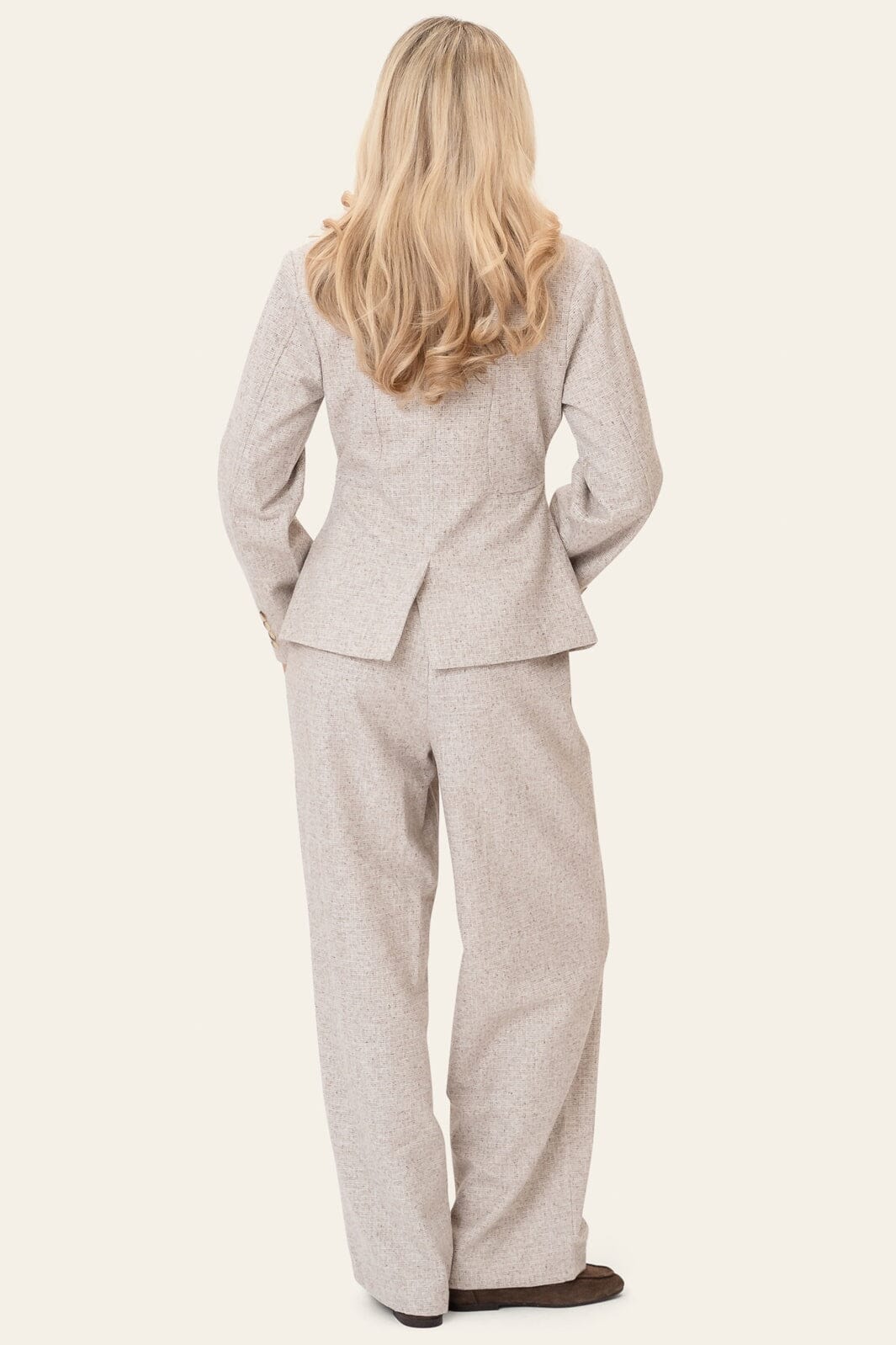 Beige blazer från BYIC med strukturerat tyg och figurnära midja. Blazern har skjortkrage, naturfärgade knappar och två fickor med lock.