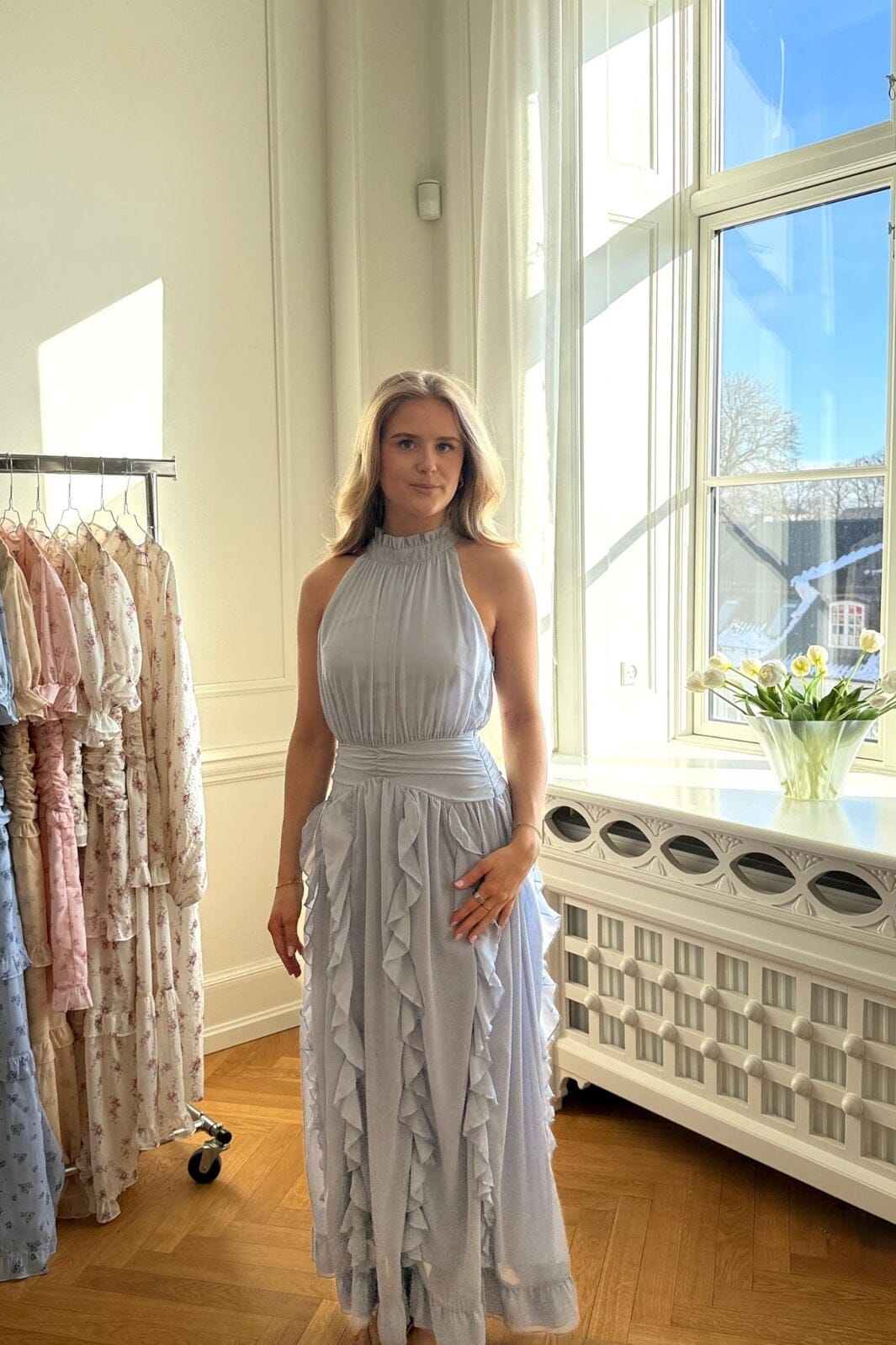 Ljusblå maxiklänning från BYIC, tillverkad av 100 % polyester. Klänningen har hög halsringning och är ärmlös med en figurnära passform.