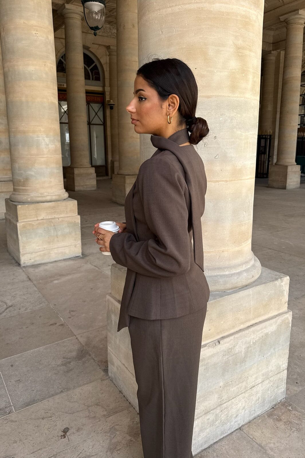 Mörkbrun blazer från BYIC med V-urringning och slim fit-passform. Blazern har ett knytbälte som kan användas i midjan eller som halsduk, och stängs med mörkbruna knappar fram.