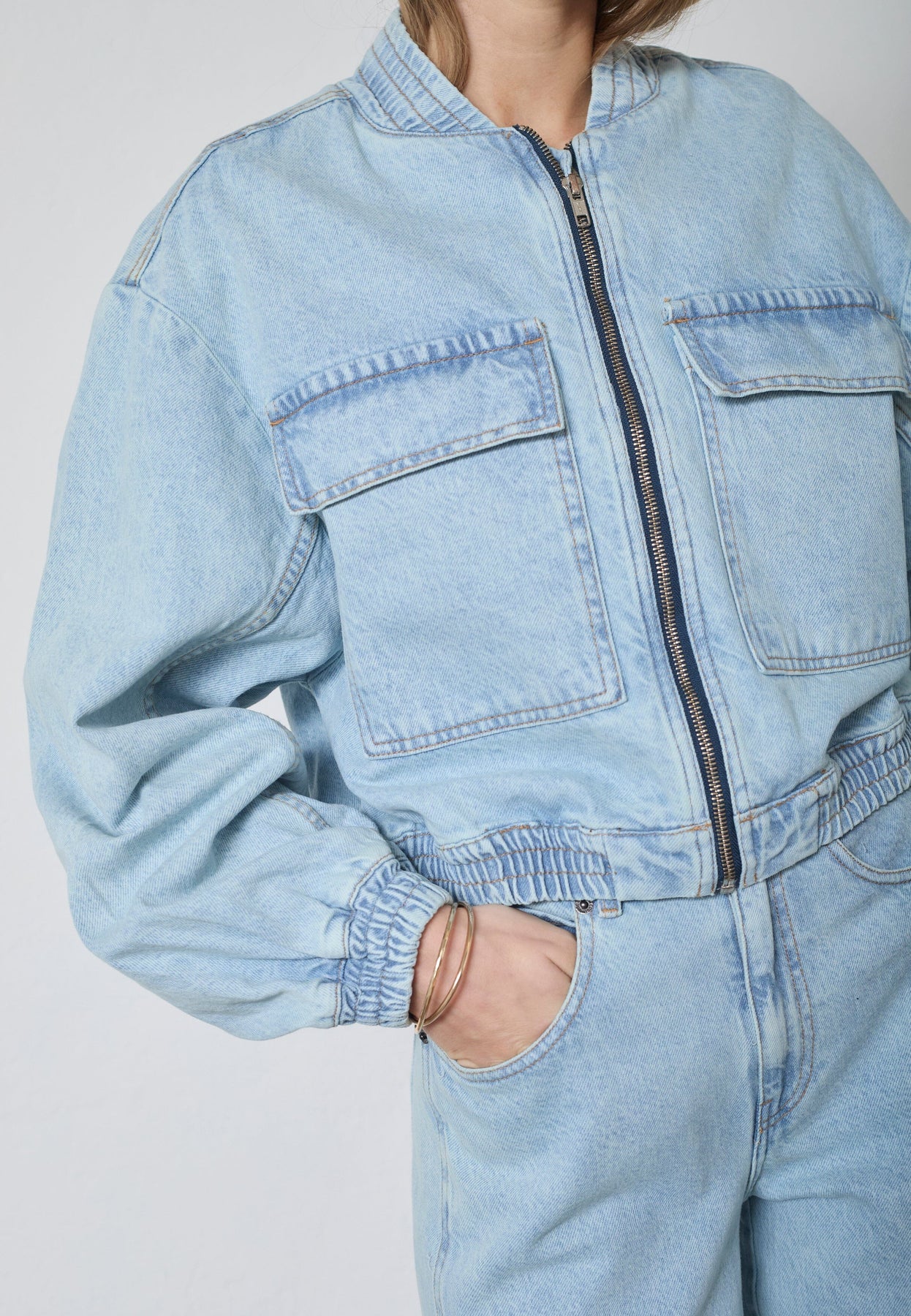 Ljusblå bomberjacka från Co´Couture, tillverkad av 100 % bomull med acid wash-finish. Jackan har dragkedja framtill och två stora fickor med lock.