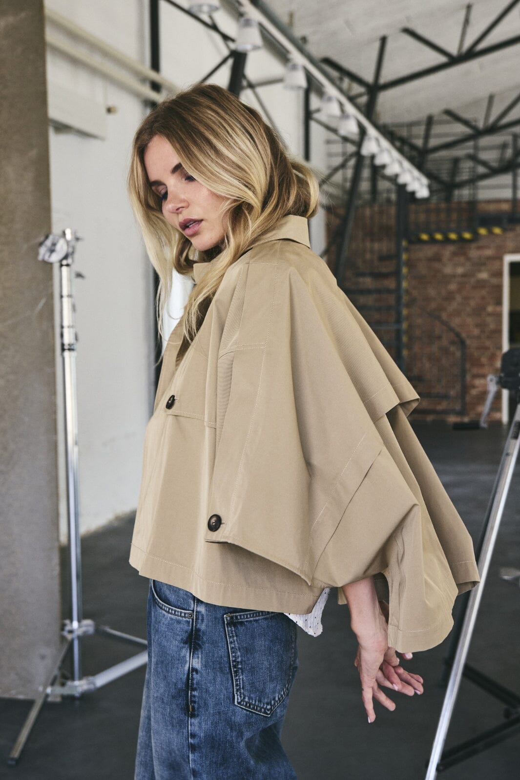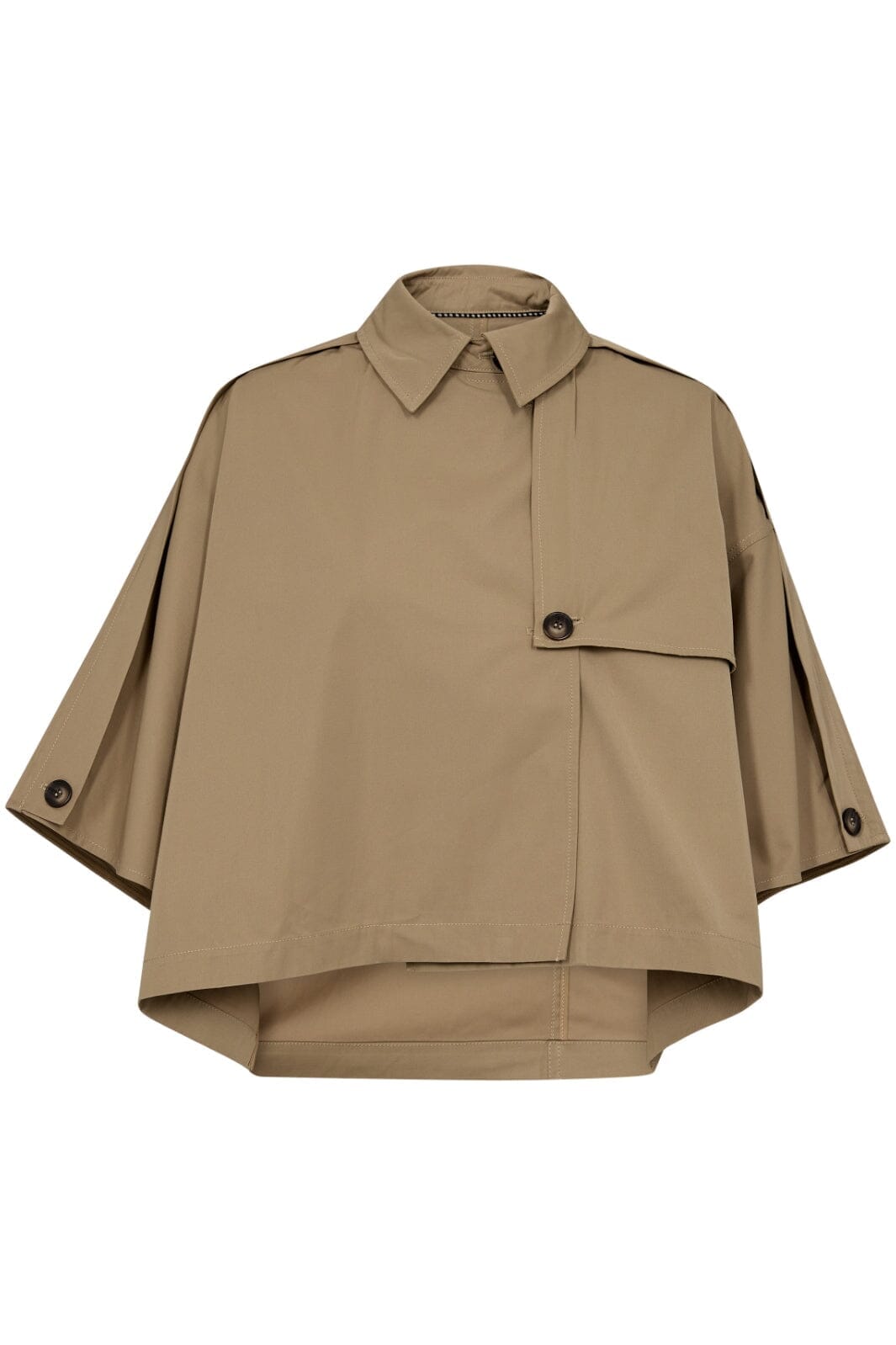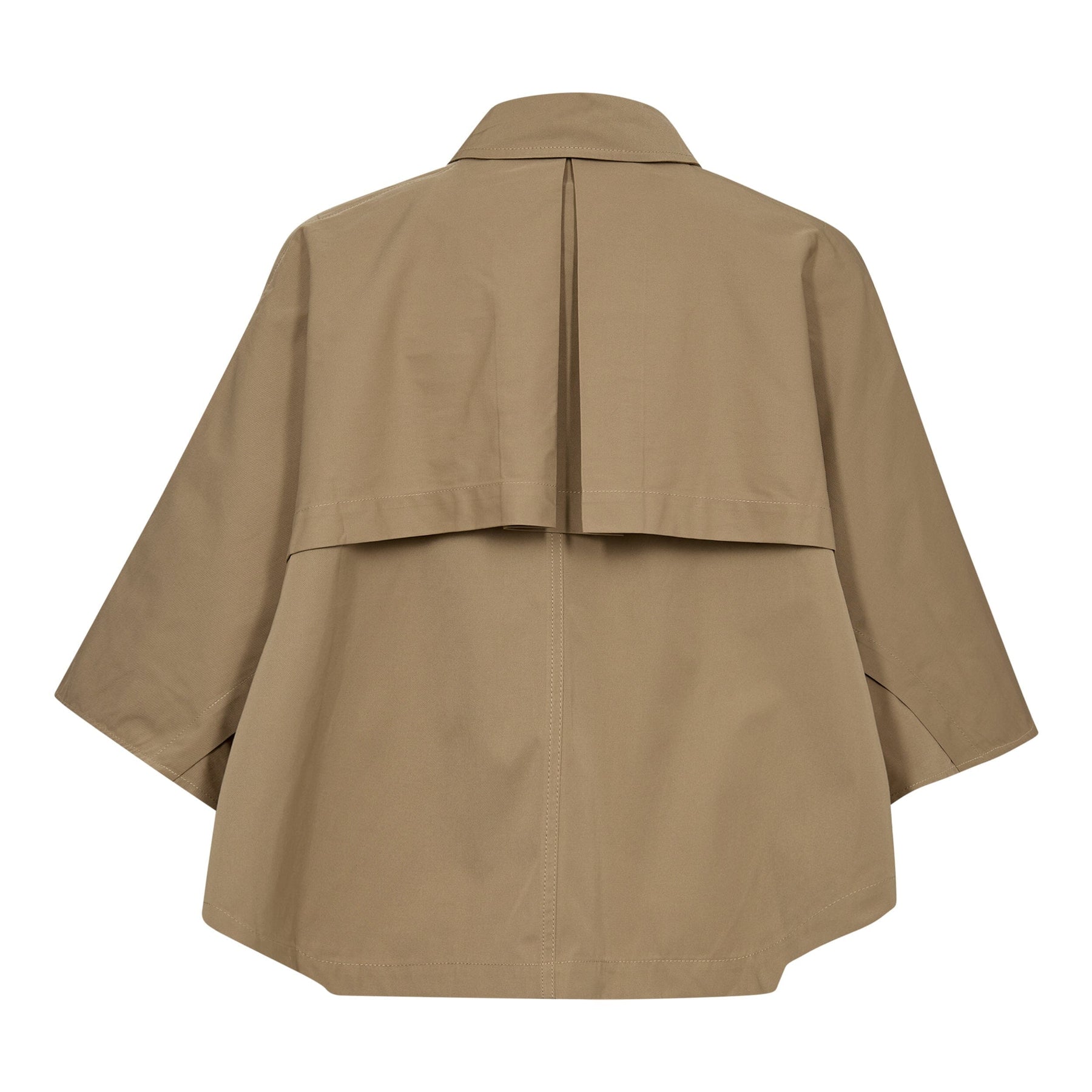 Khaki-jacka från Co'Couture med kort cape-design. Den har skjortkrage, knappar fram och plissering bak. Ärmarna är 3/4-långa med bred passform.