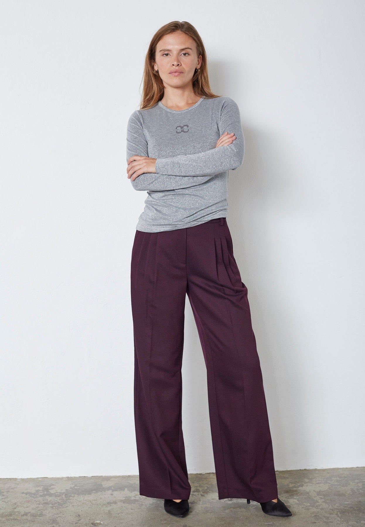 Silverfärgad långärmad t-shirt från Co'Couture med broderi på bröstet. T-shirten har en rund halsringning och ett glänsande uttryck från metalltrådarna i tyget.