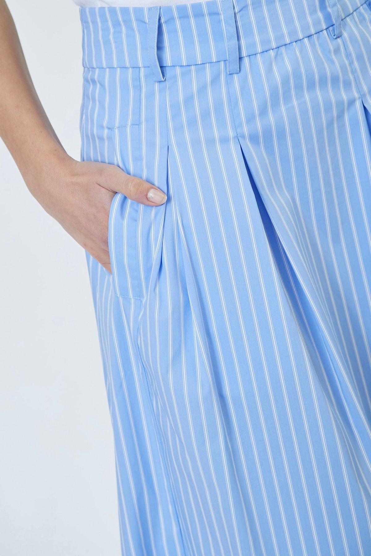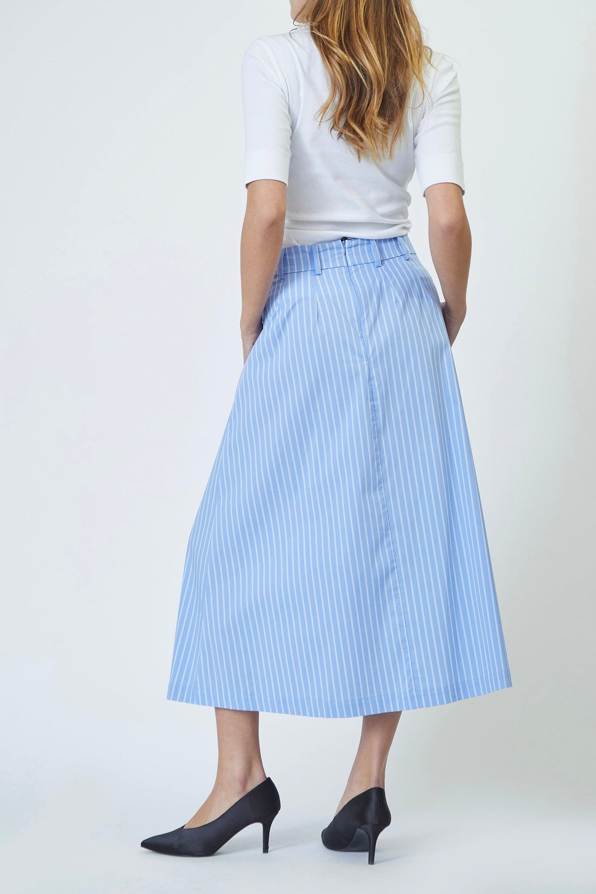 Ljusblå plisserad kjol från Co'Couture med vita ränder. Den har midilängd och är utrustad med dragkedja och knappar i midjan.