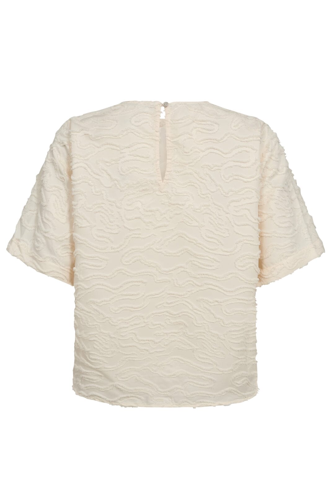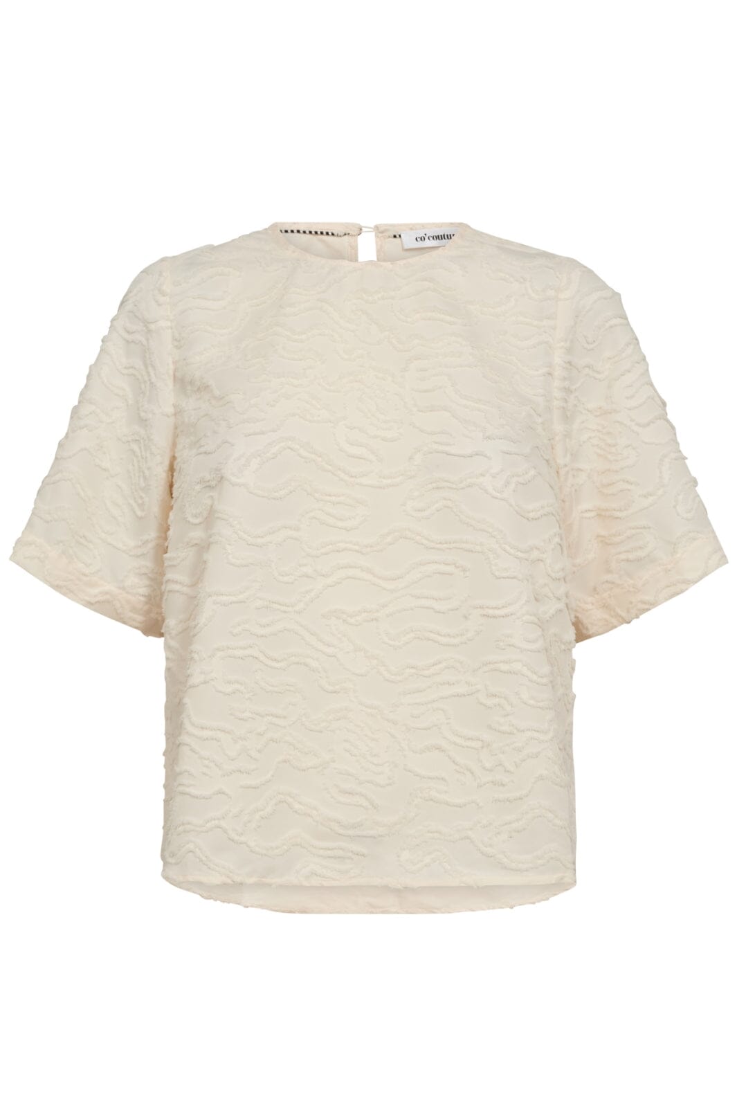 Blus från Co´Couture i benfärg med vågig textur och dekorativa sömmar. Den har korta ärmar och en rund halsringning med knapp i nacken.