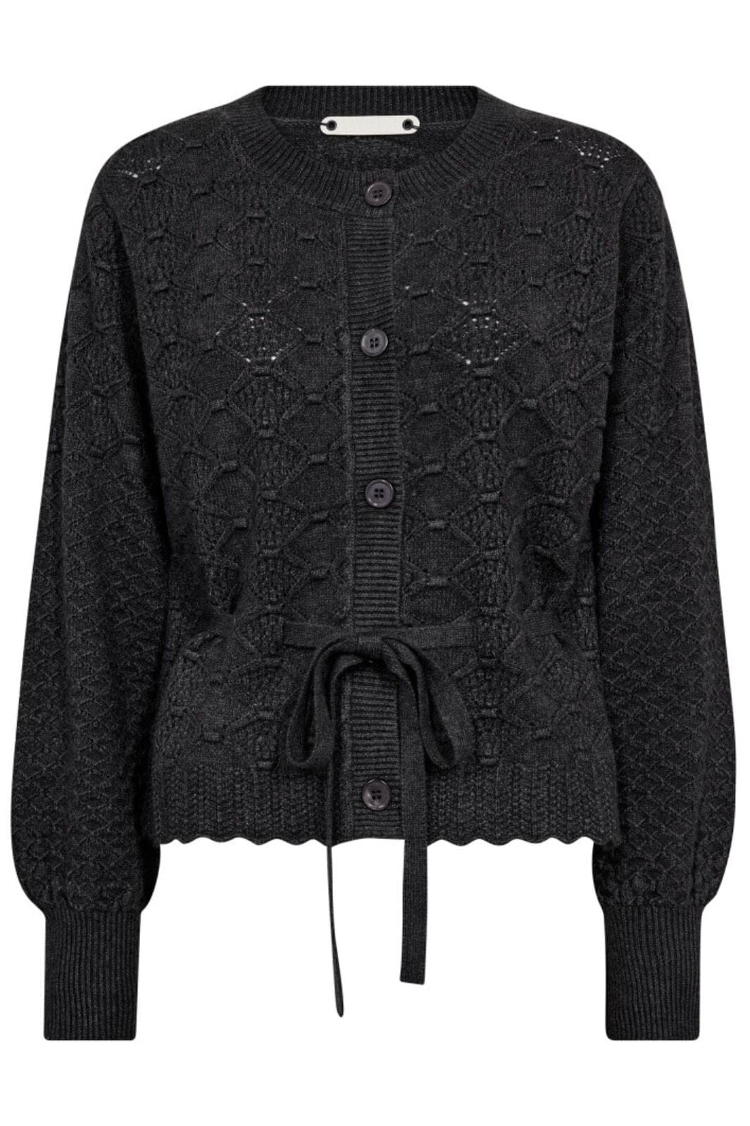Mörkgrå cardigan från Co'Couture med pointelle-mönster. Den har knappar framtill och knytskärp i midjan. Ribbstickade muddar ger en bra passform vid handlederna.