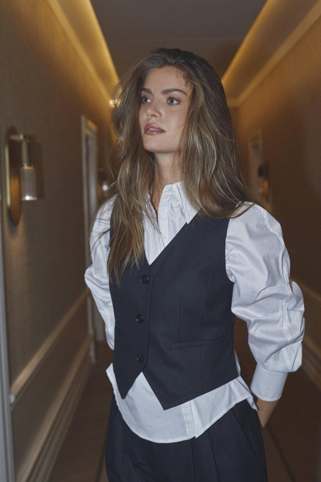 Svart väst från Co'Couture med V-ringning och öppen rygg. Den har tre knappar framtill och ett justerbart band baktill.
