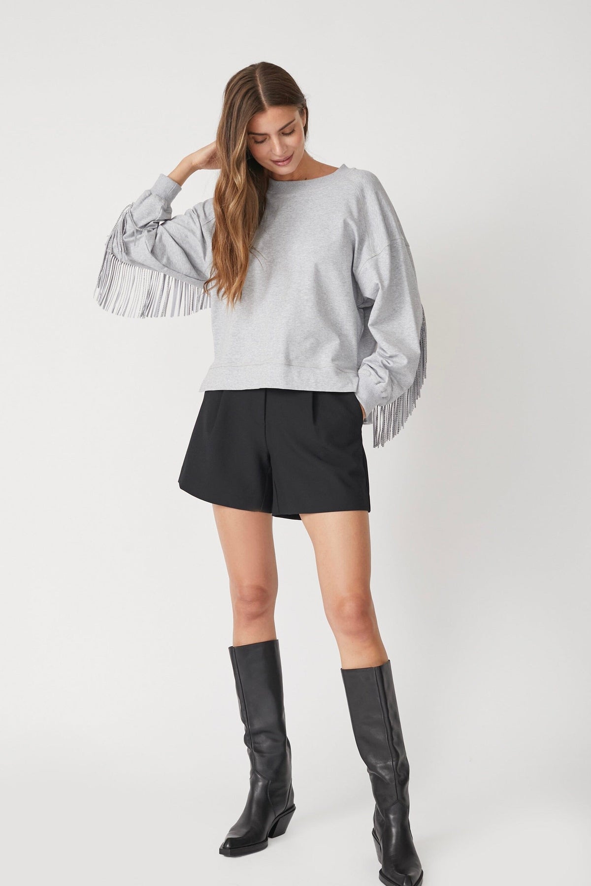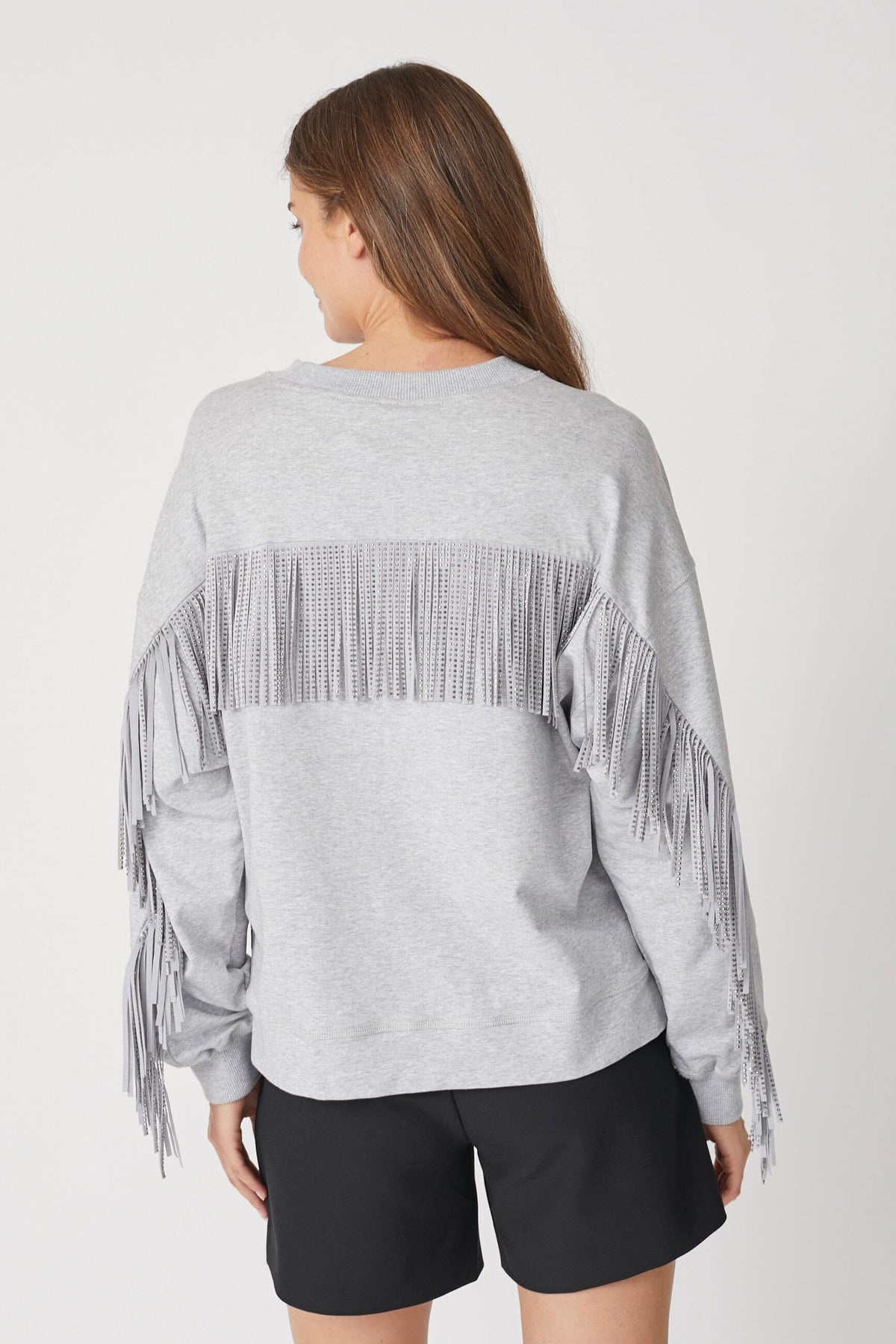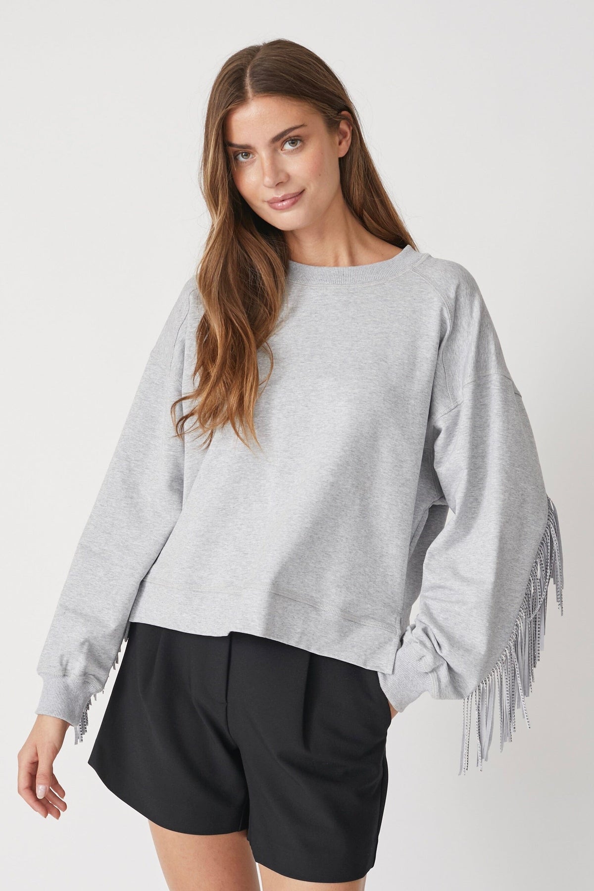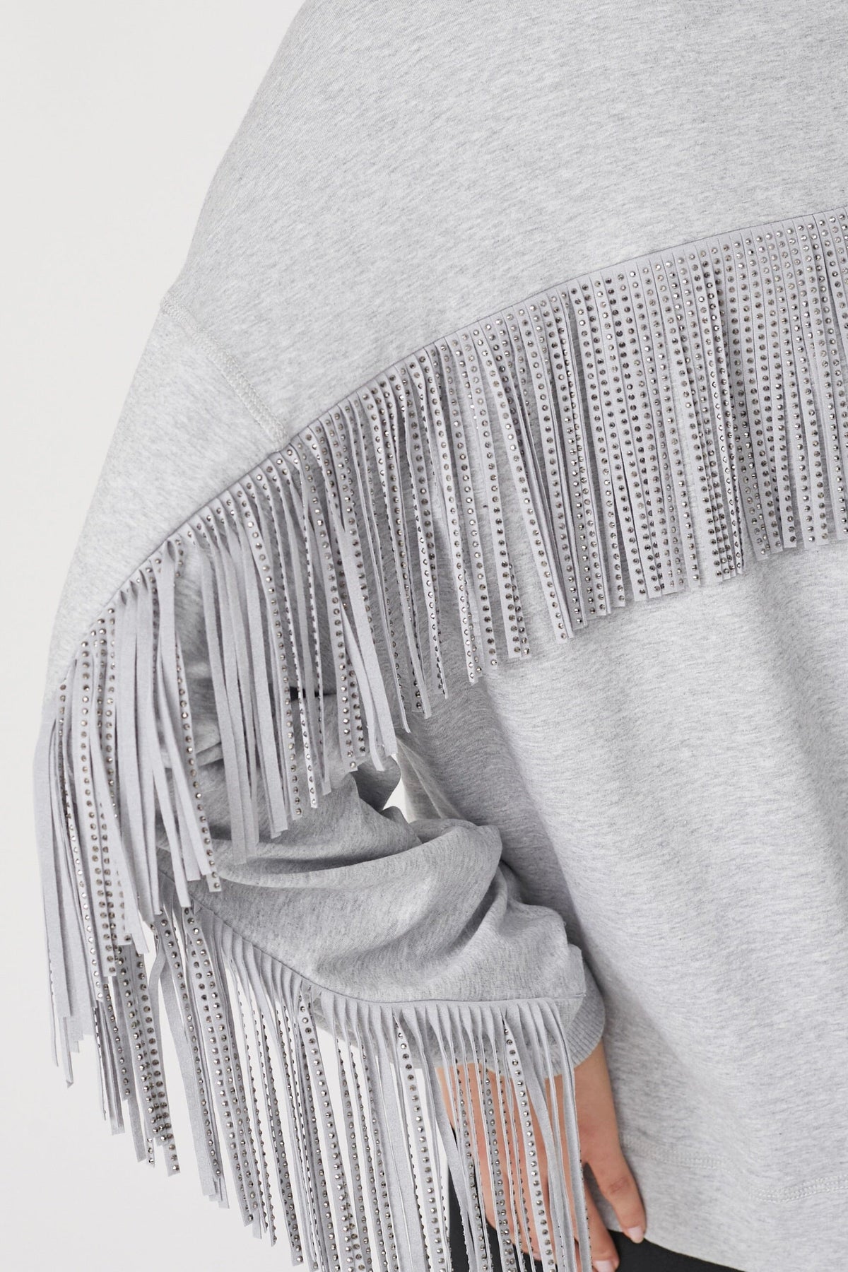 Ljusgrå sweatshirt från Co'Couture med fransar på ärmarna och ryggen. Den runda halsringningen och de långa ärmarna ger en ren och enkel look.