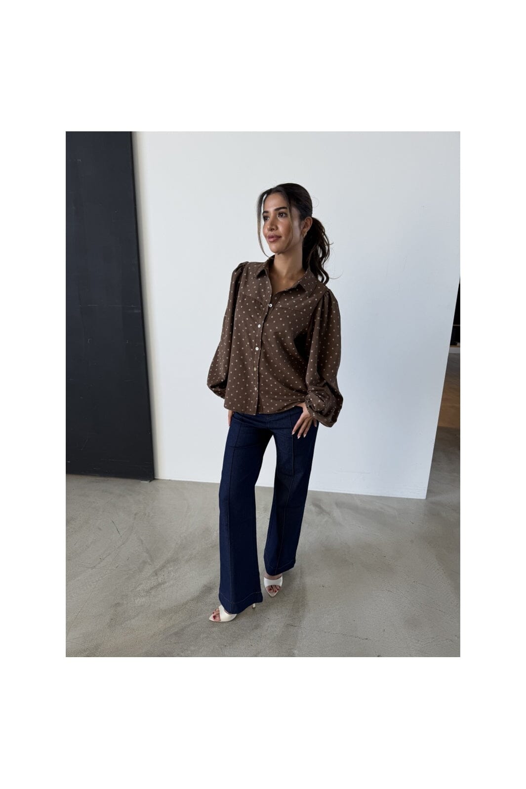 Brun blus från Continue med prickigt mönster. Blusen har ballongärmar och en klassisk skjortkrage med vita knappar. Den är sydd i polyester med en regular fit.