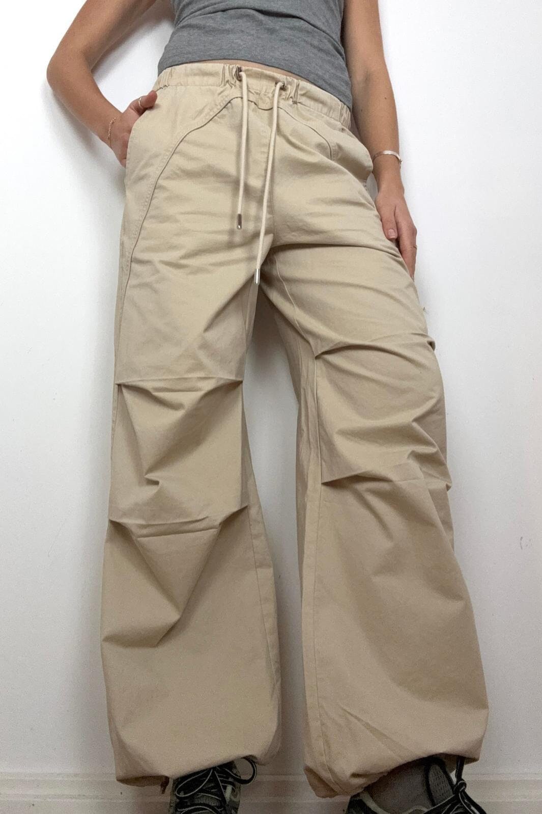Beige byxor från Continue i en sandfärgad nyans. Byxorna har en lös passform med dekorativa sömmar och dragskodetaljer i midjan.