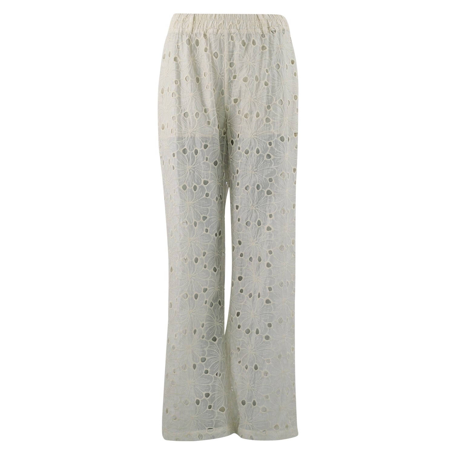 Lång jumpsuit från Continue i off-white spets med blommönster. Den har korta ärmar, knapplåsning fram och ett band i midjan som kan justeras efter önskemål.