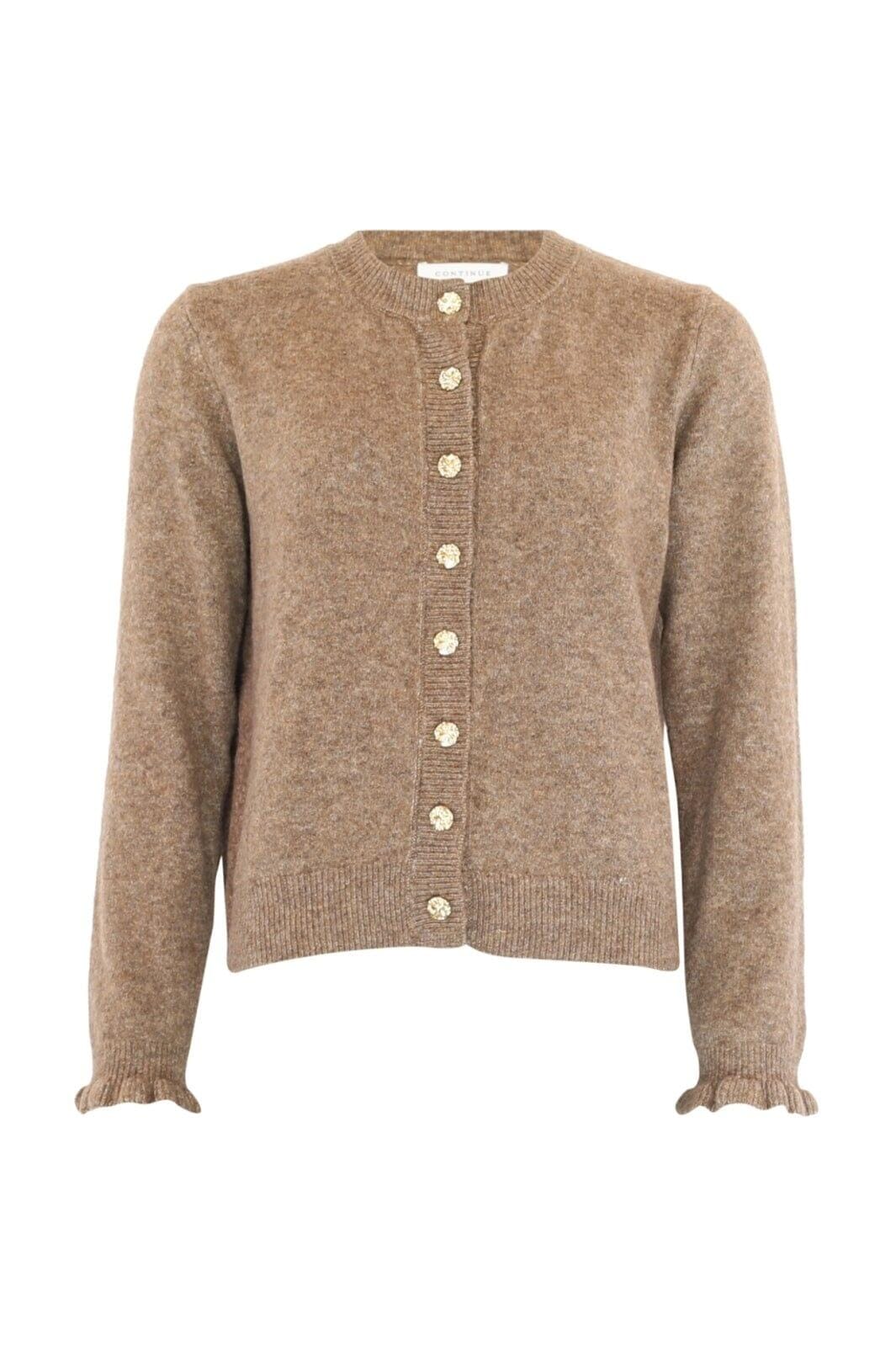 Brun kofta från Continue med rund halsringning och guldfärgade knappar. Stickad i en blandning av ull och mohair med ribbade kanter vid ärmarna och nederkanten.