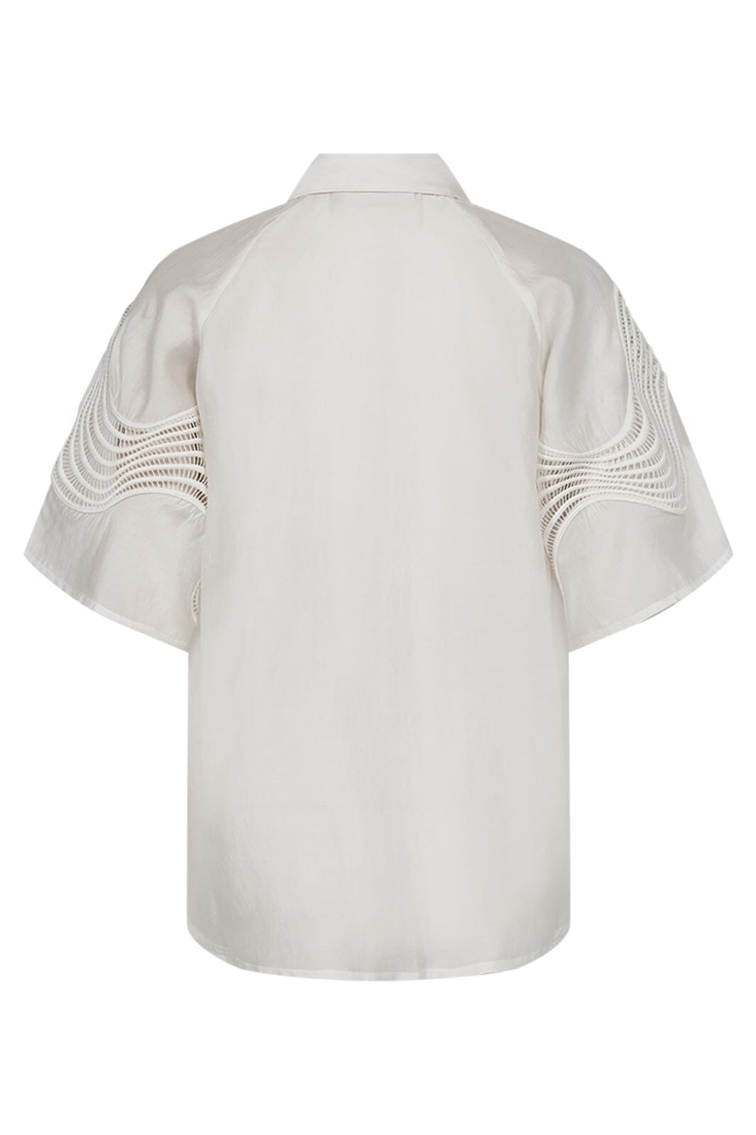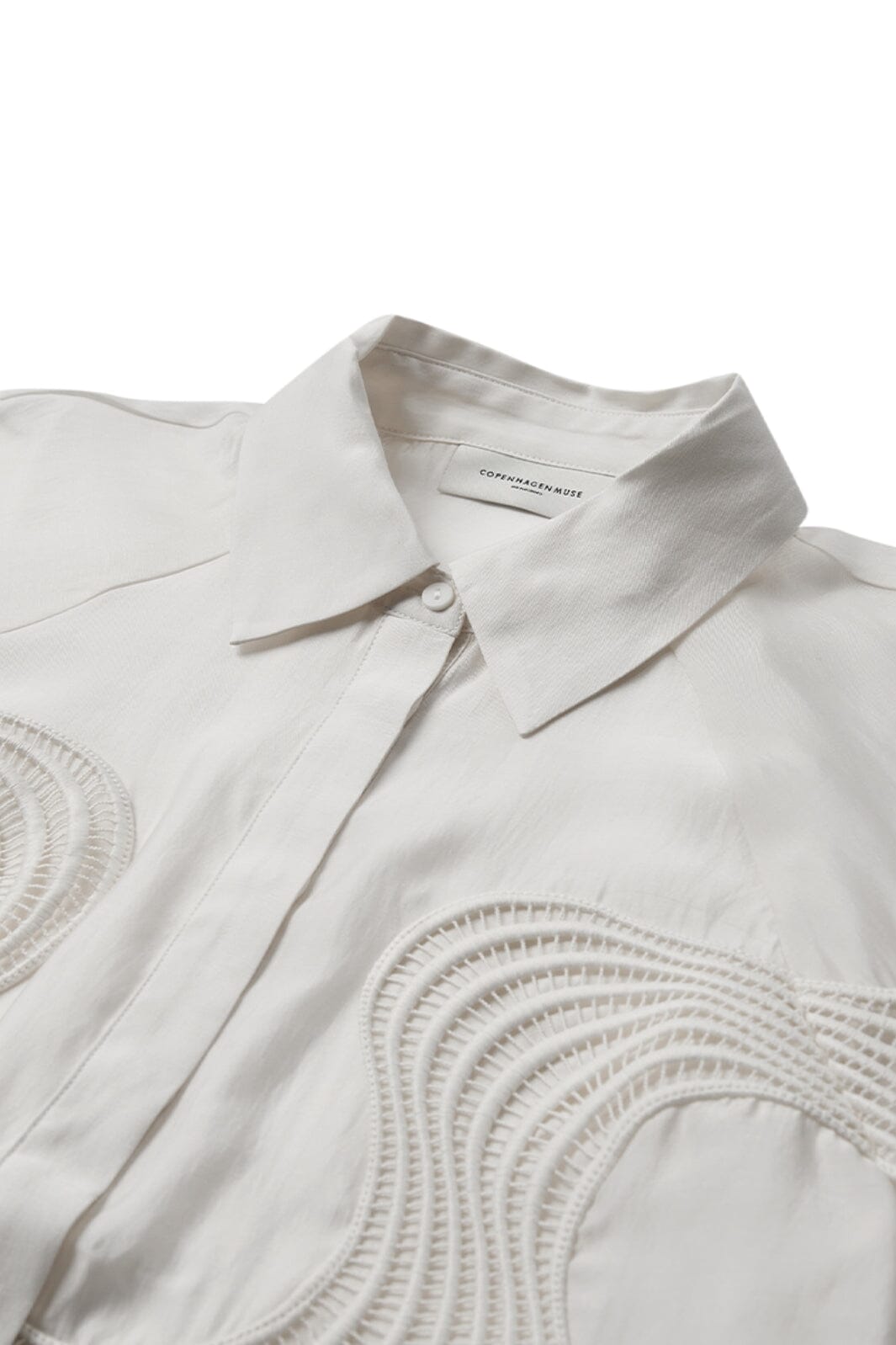 Skjorta från Copenhagen Muse i Jet Stream-färg med broderi på ärmarna och axlarna. Den har skjortkrage och knappar fram. Den ljusa färgen tillsammans med broderiet skapar ett rent uttryck.