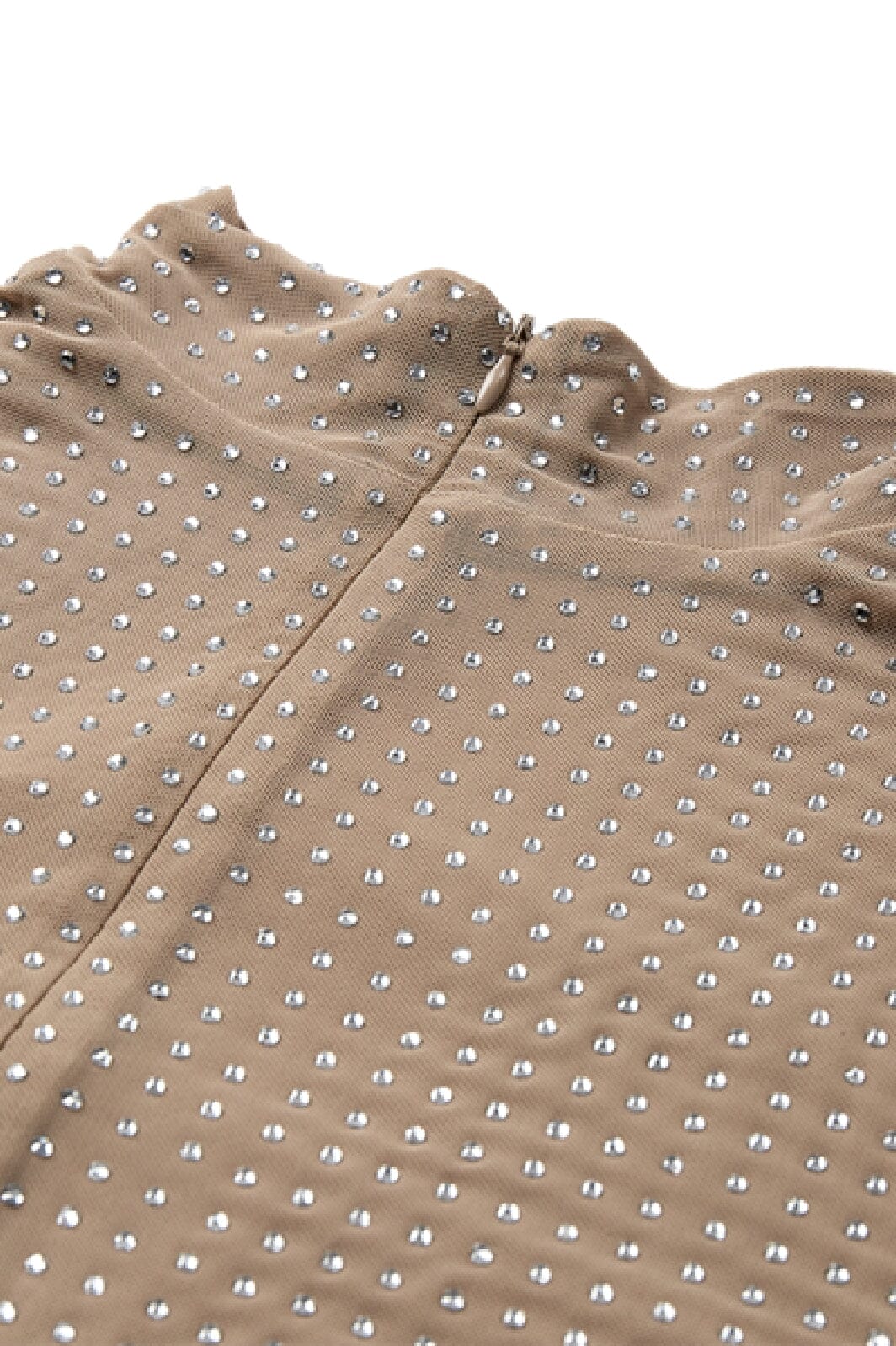 Långärmad blus från Copenhagen Muse i varm sandfärg. Blusen har hög krage och är täckt av små, glänsande fyrkantiga dekorationer. En dragkedja på ryggen gör den lätt att ta av och på.