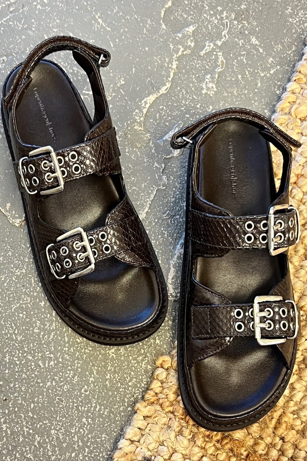 Mörkbrun sandal från Copenhagen Shoes, tillverkad av läder. Sandalen har två metallspännen och kardborrestängning, en tjock sula och en hälrem.