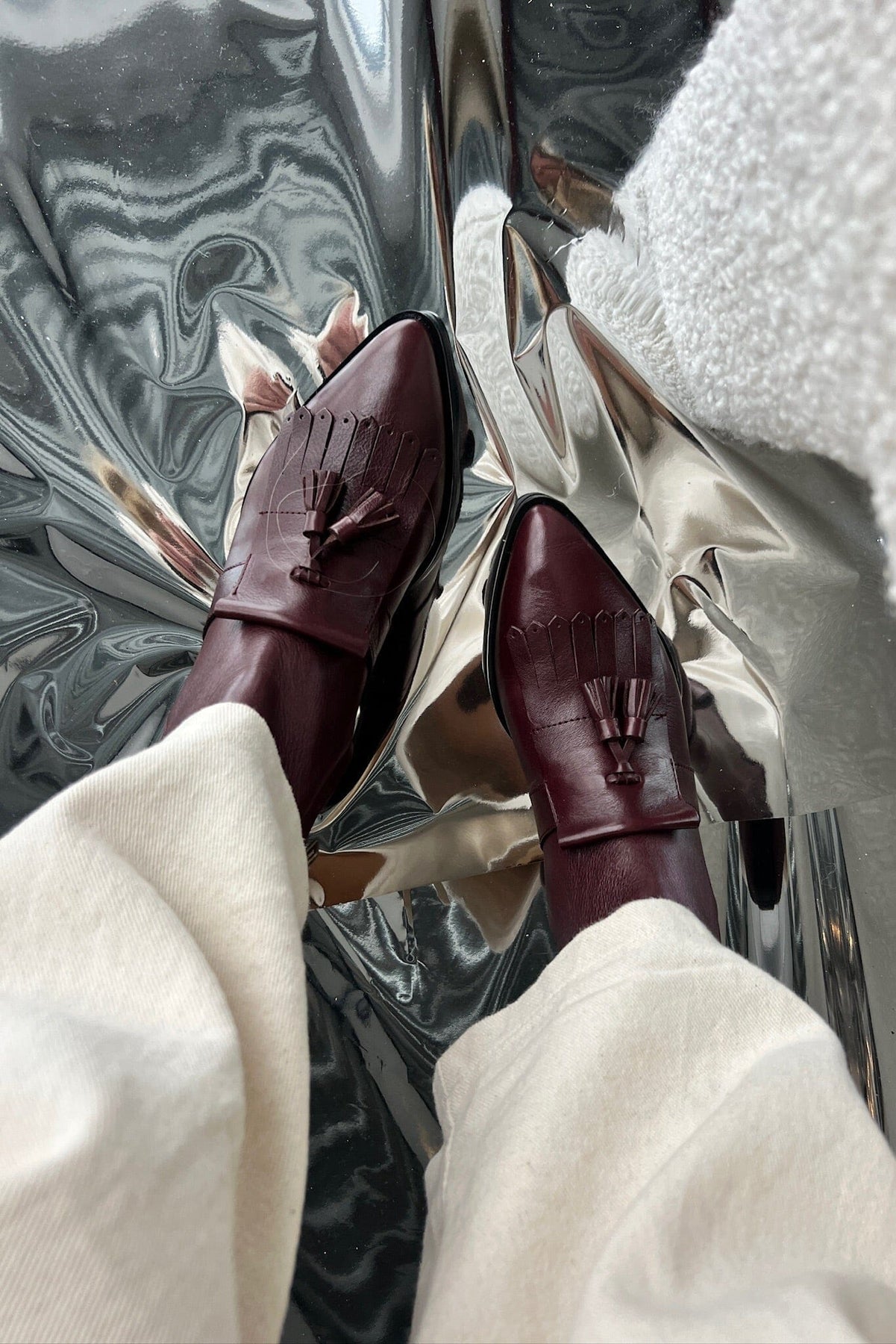 Ankelstövlar från Copenhagen Shoes, tillverkade av läder i en varm bordeauxnyans. Stövlarna har tofsar och fransar över vristen, spetsig tå och en praktisk dragkedja på insidan.