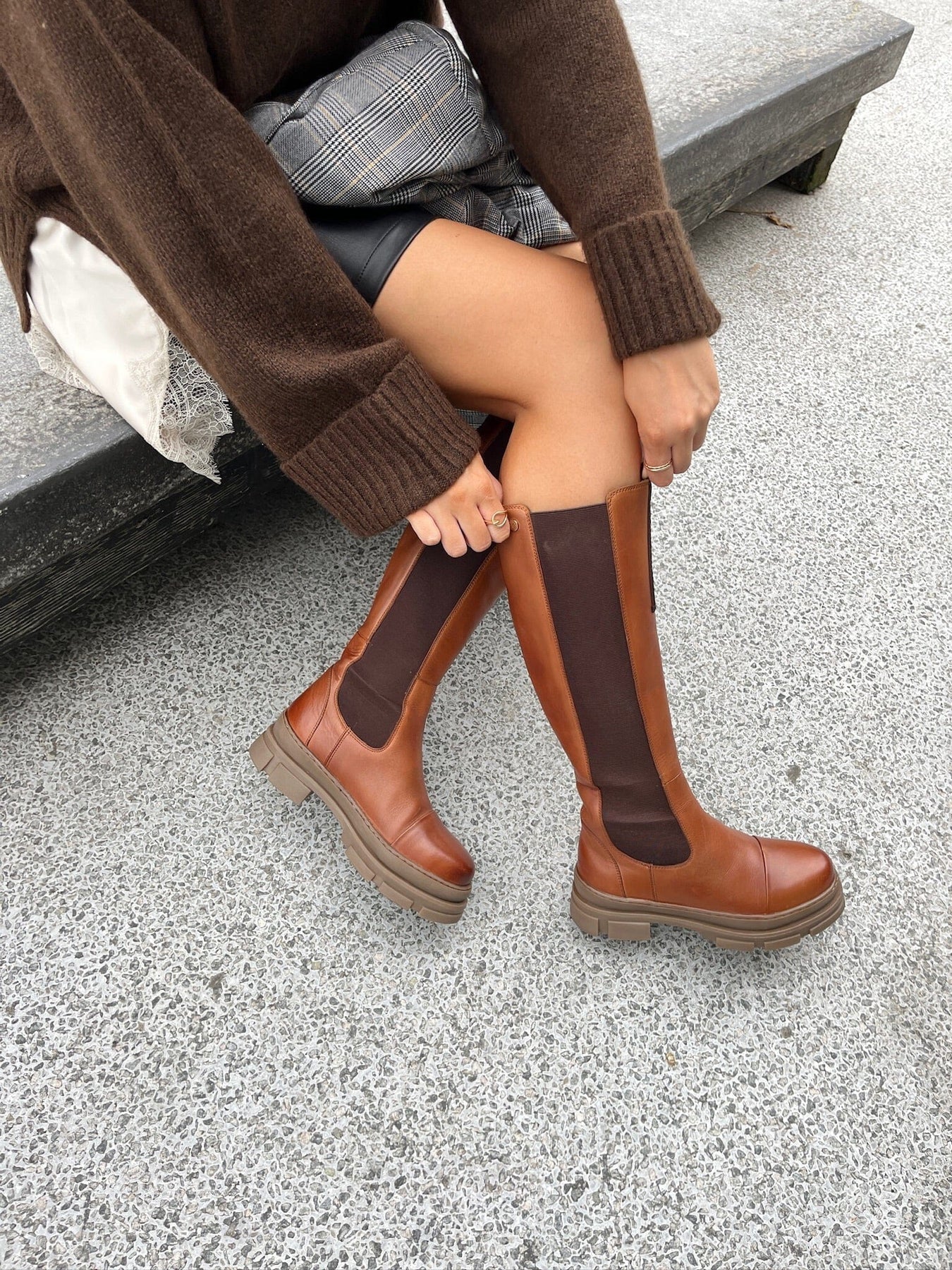 Knee-high stövlar i cognacfärgat läder med mörka elastiska paneler på sidorna. TPR-sulan har en chunky design som ger bra stöd för foten.