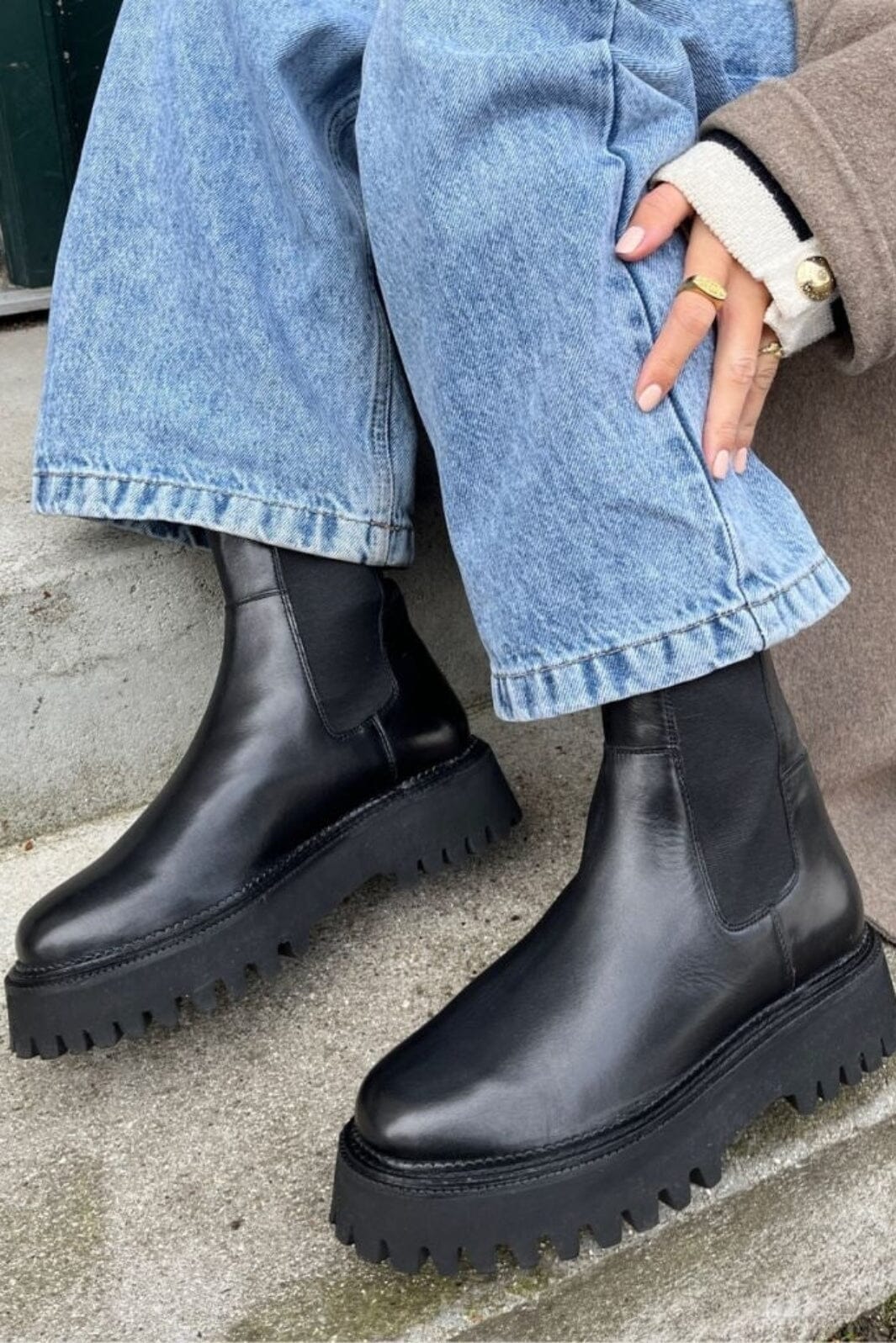 Svart ankelboot i läder med elastiska sidor och blockklack. Booten har en rund tå och en klackhöjd på 5-8 cm.