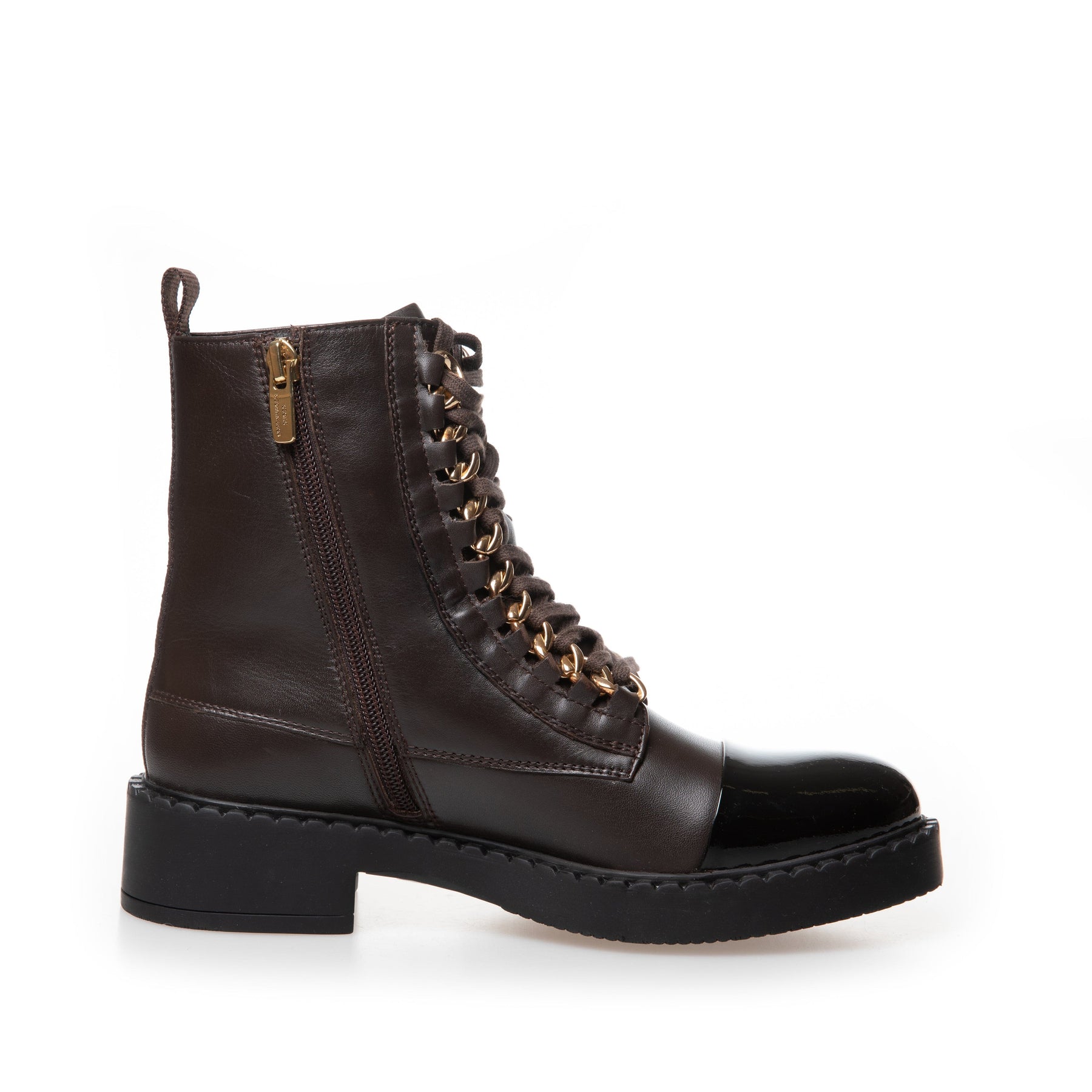 Ankelstövlar i brunt och svart läder med blank svart tåspets. Stöveln har både snörning och dragkedja samt en kraftig blockklack som är lägre än 5 cm.