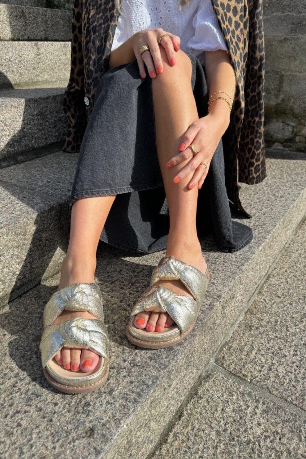 Sandaler från Copenhagen Shoes i läder med metallisk guld/beige finish. De snoade remmarna ger sandalerna en unik karaktär, och den platta sulan säkerställer god stabilitet.