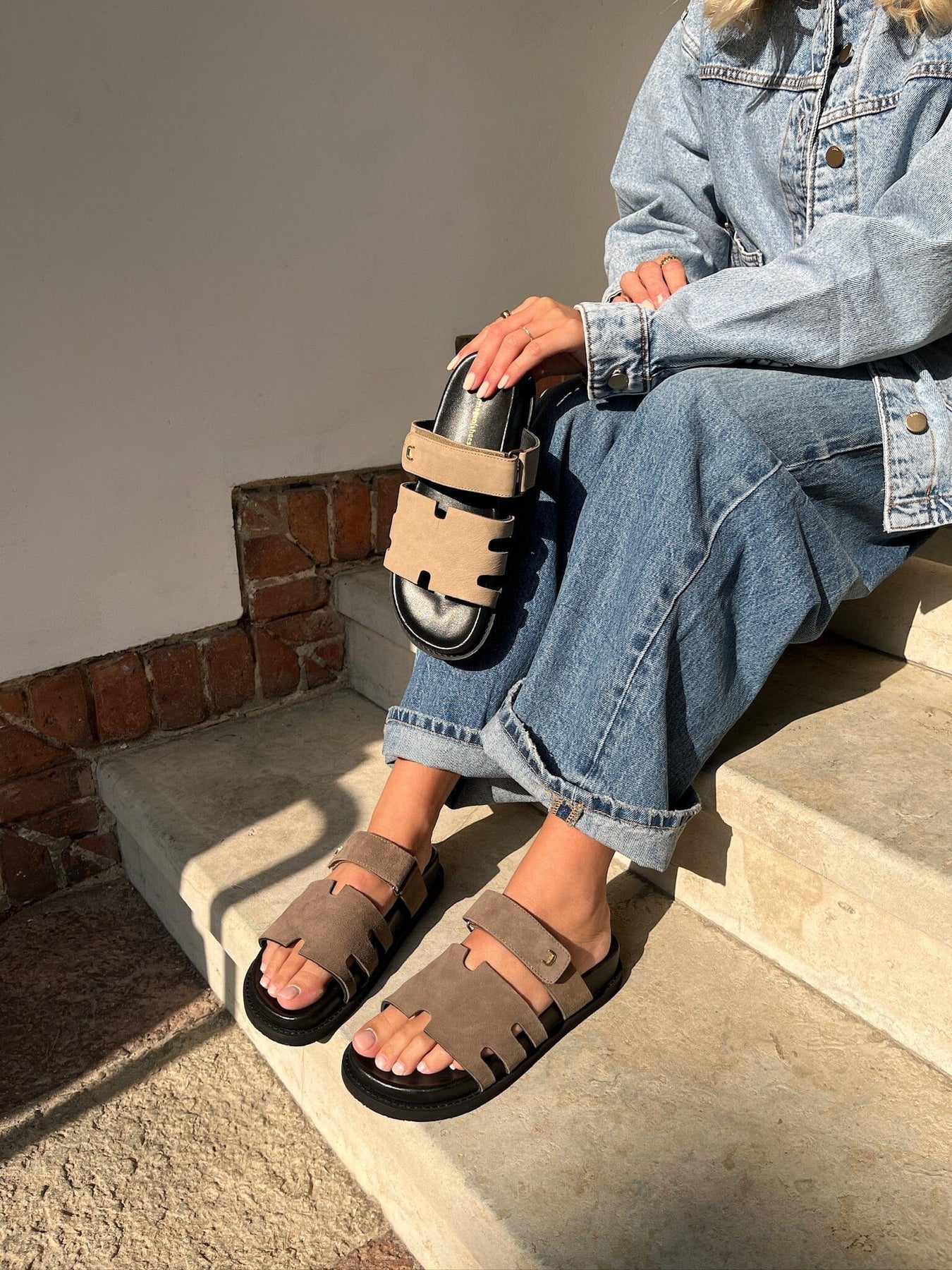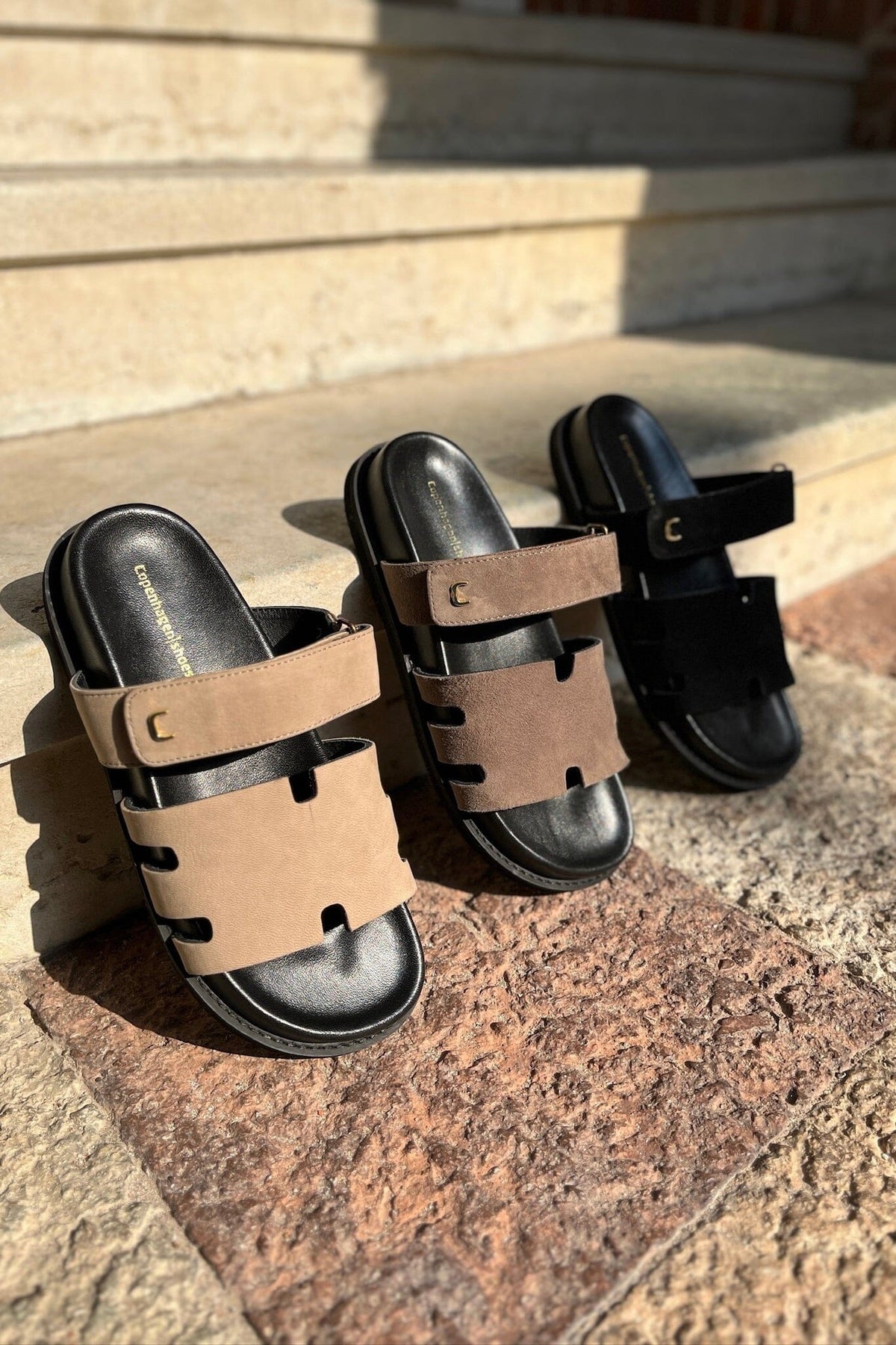 Sandal i musegrå mocka från Copenhagen Shoes. Den mjuka sandalen har öppen tå och svart sula med kardborreband som ger enkel justering av passformen.