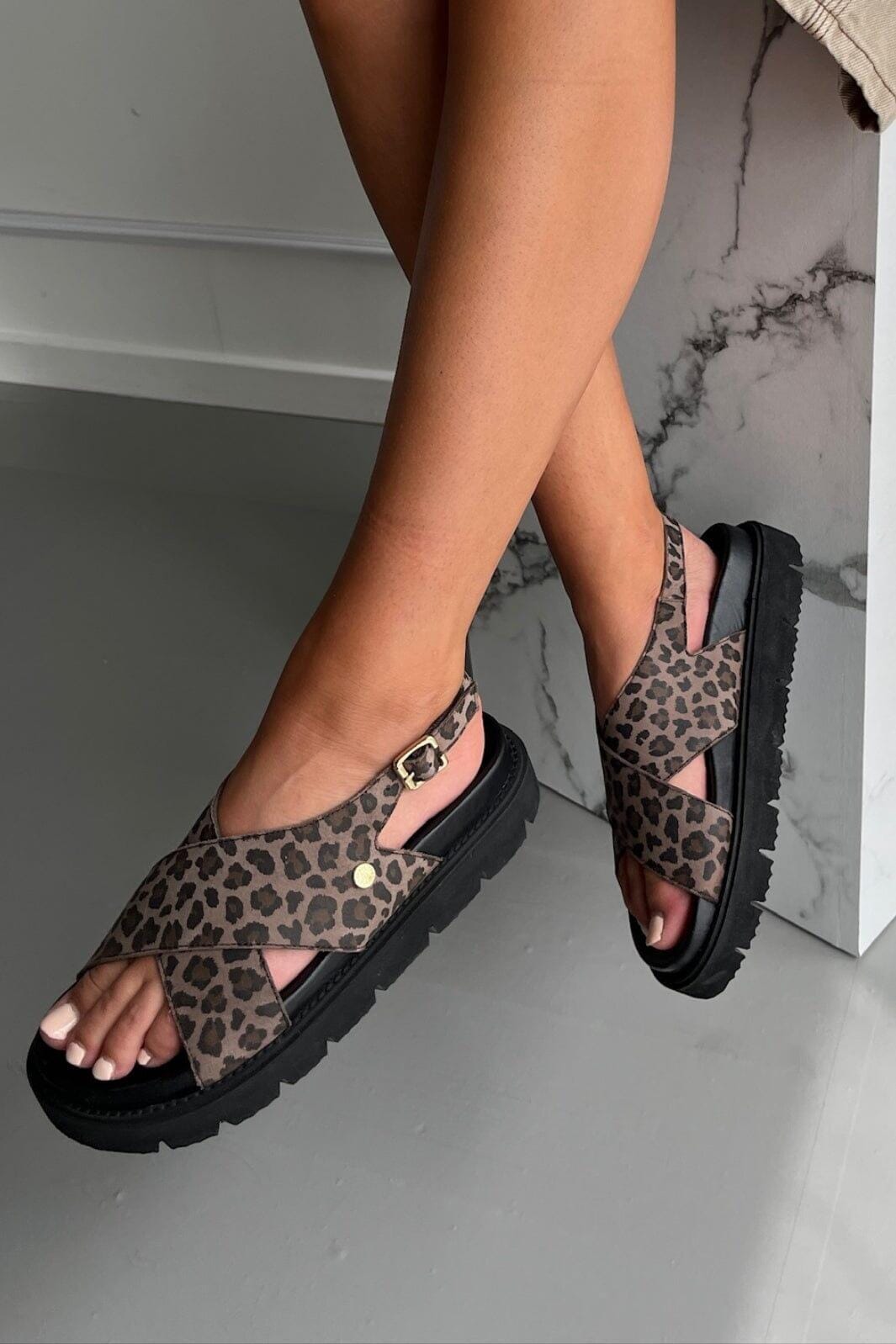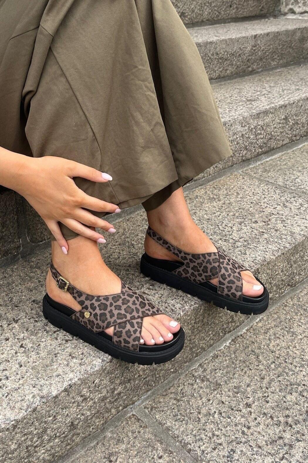 Sandaler från Copenhagen Shoes i mocka med svart och brunt leopardmönster. Sandalerna har korsande remmar över foten och en praktisk spänne-stängning vid ankeln.