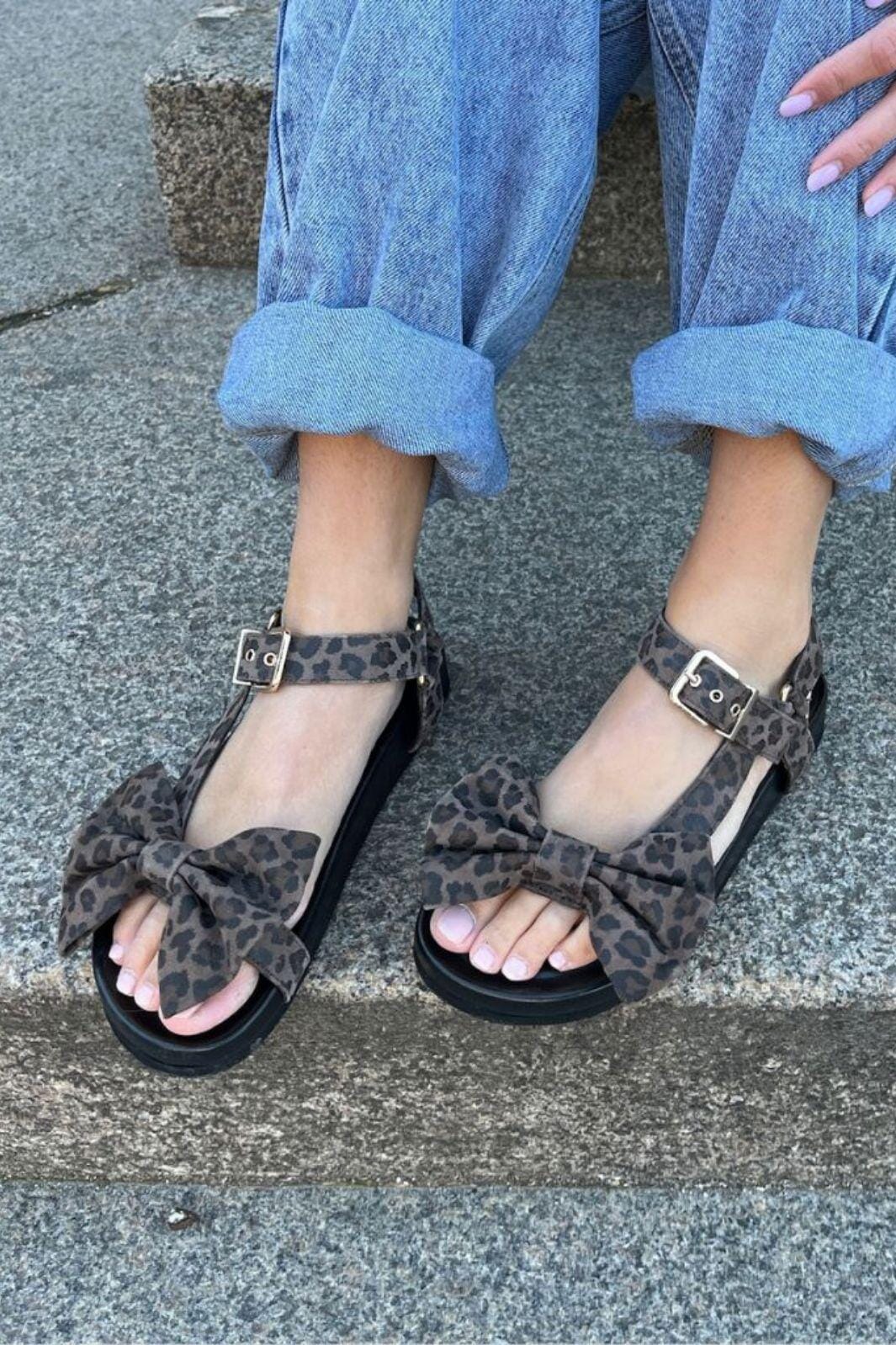 Sandal från Copenhagen Shoes i mocka och läder med leopardtryck i nyansen Mouse. Den stora rosetten fram och spännet ger sandalen ett feminint uttryck.